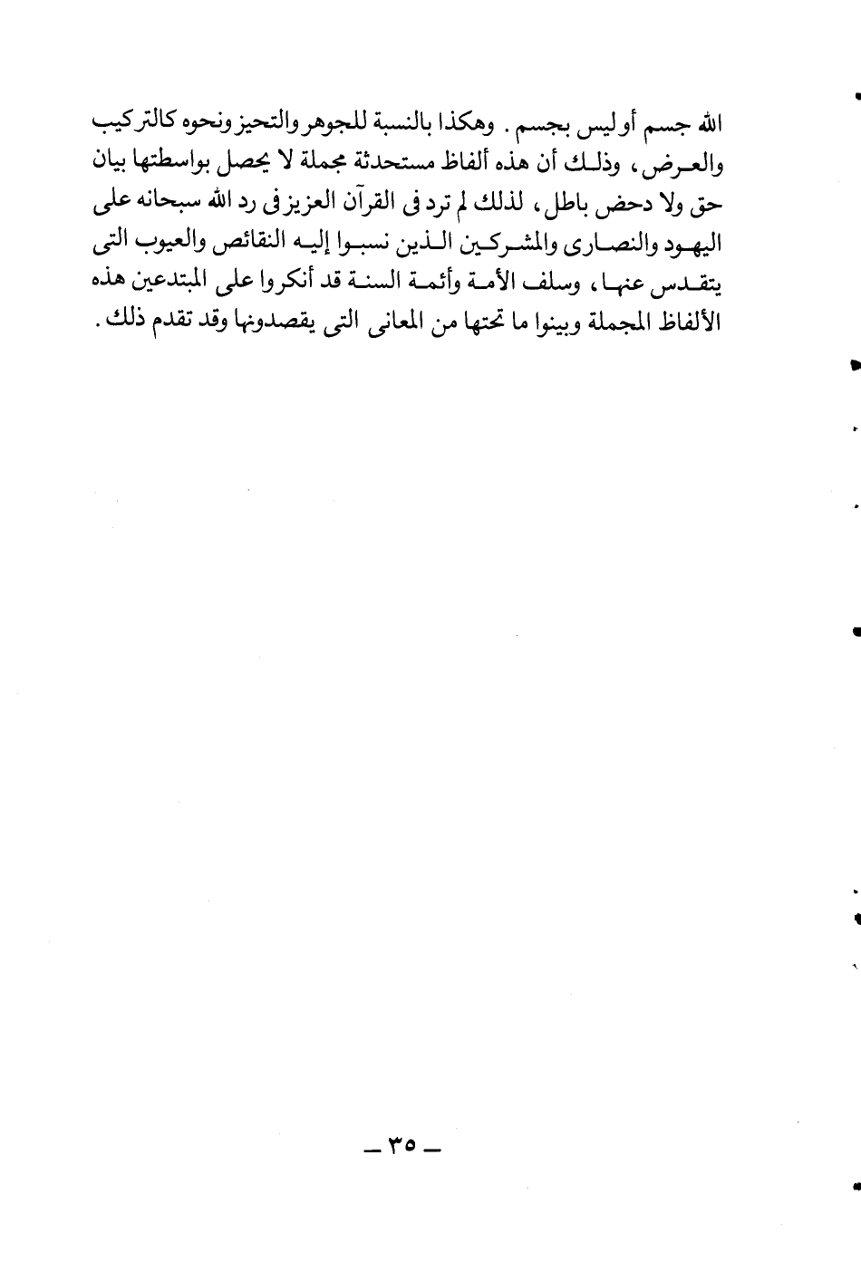 الله جسم أو ليس بجسم. وهكذا بالنسبة للجوهر والتحيز ونحوه كالتركيب والعرض، وذلك أن هذه ألفاظ مستحدثة مجملة لا يحصل بواسطتها بيان حق ولا دحض باطل، لذلك لم ترد في القرآن العزيز في رد الله سبحانه على اليهود والنصارى والمشركين الذين نسبوا إليه النقائص والعيوب التي يتقدس عنها، وسلف الأمة وأئمة السنة قد أنكروا على المبتدعين هذه الألفاظ المجملة وبينوا ما تحتها من المعاني التي يقصدونها وقد تقدم ذلك.