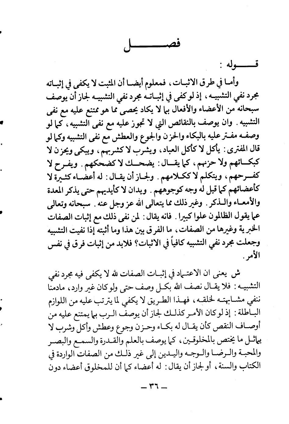 ش: يعنى أن الاعتماد في إثبات الصفات لله لا يكفي فيه مجرد نفي التشبيه: فلا يقال نصف الله بكل وصف حتى ولو كان غير وارد، مادمنا ننفي مشابهته لخلقه، فهذا الطريق لا يكفي لما يترتب عليه من اللوازم الباطلة، إذ لو كان الأمر كذلك لجاز أن يوصف الرب بما يمتنع عليه من أوصاف النقص كأن يقال له بكاء وحزن وجوع وعطش وأكل وشرب لا يماثل ما يختص بالمخلوقين، كما يوصف بالعلم والقدرة والسمع والبصر والمحبة والرضا والوجه واليدين إلى غير ذلك من الصفات الواردة في الكتاب والسنة، أو لجاز أن يقال: له أعضاء كما أن للمخلوق أعضاء دون