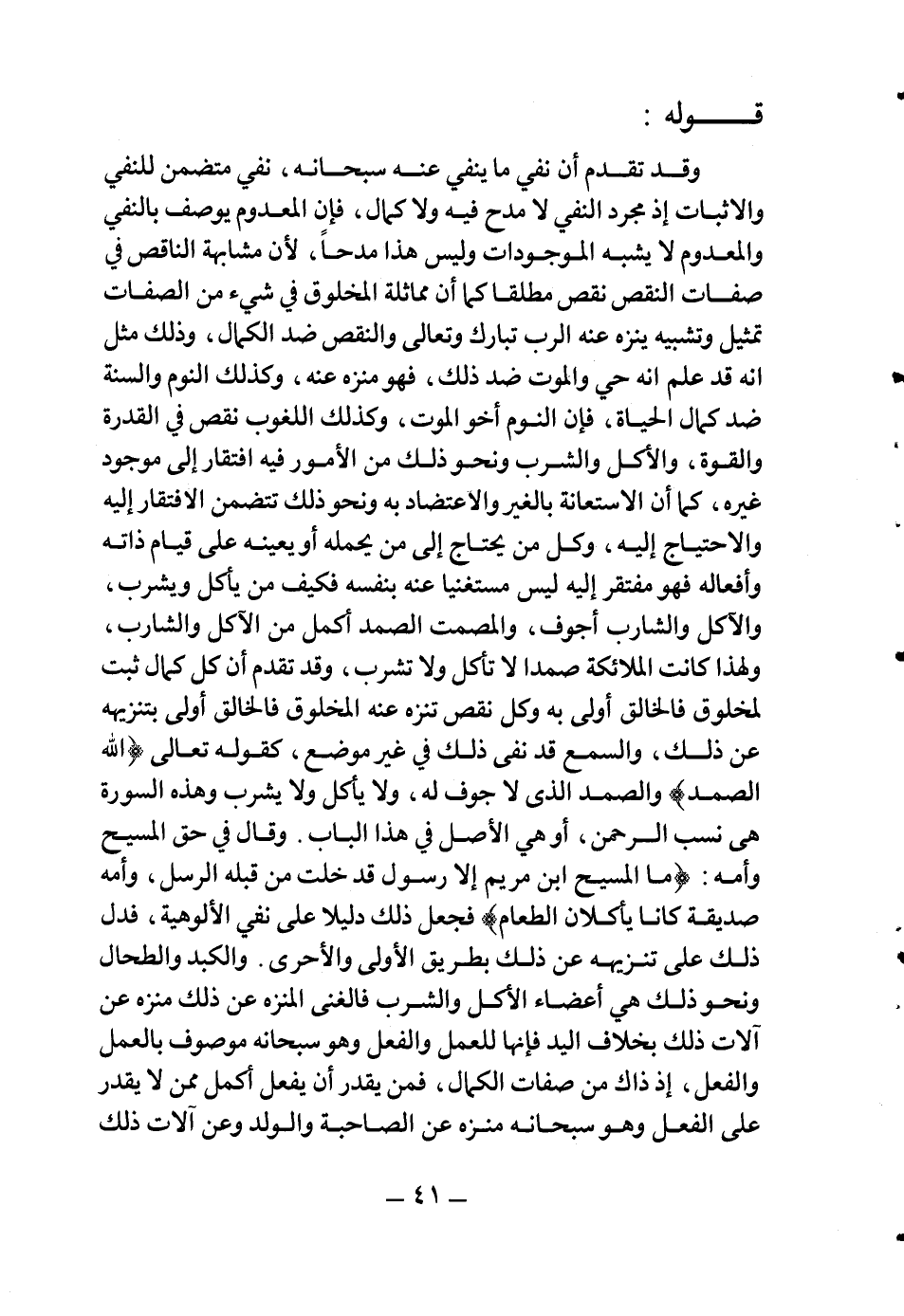 وقد تقدم أن نفي ما ينفي عنه سبحانه، نفي متضمن للنفي والإثبات إذ مجرد النفي لا مدح فيه ولا كمال، فإن المعدوم يوصف بالنفي والمعدوم لا يشبه الموجودات وليس هذا مدحا، لأن مشابهة الناقص في صفات النقص نقص مطلقا كما أن مماثلة المخلوق في شيء من الصفات تمثيل وتشبيه ينزه عنه الرب تبارك وتعالى والنقص ضد الكمال، وذلك مثل أنه قد علم أنه حي والموت ضد ذلك، فهو منزه عنه، وكذلك النوم والسنة ضد كمال الحياة، فإن النوم أخو الموت، وكذلك اللغوب نقص في القدرة والقوة، وأكل والشرب ونحو ذلك من الأمور فيه افتقار إلى موجود غيره، كما أن الاستعانة بالغير والاعتضاد به ونحو ذلك تتضمن الافتقار إليه والاحتياج إليه، وكل من يحتاج إلى من يحمله أو يعينه على قيام ذاته وأفعاله فهو مفتقر إليه ليس مستغنيا عنه بنفسه فكيف من يأكل ويشرب، والآكل والشارب أجوف، والمصمت الصمد أكمل من الآكل والشارب، ولهذا كانت الملائكة صمدا لا تأكل ولا تشرب، وقد تقدم أن كل كمال ثبت لمخلوق فالخالق أولى به وكل نقص تنزه عنه المخلوق فالخالق أولى بتنزيهه عن ذلك، والسمع قد نفى ذلك في غير موضع، كقوله تعالى: {اللَّهُ الصَّمَدُ} والصمد الذي لا جوف له، ولا يأكل ولا يشرب، وهذه السورة هي نسب الرحمن، أو هي الأصل في هذا الباب. وقال في حق المسيح وأمه: {مَا الْمَسِيحُ ابْنُ مَرْيَمَ إِلَّا رَسُولٌ قَدْ خَلَتْ مِنْ قَبْلِهِ الرُّسُلُ وَأُمُّهُ صِدِّيقَةٌ كَانَا يَأْكُلانِ الطَّعَامَ} ، فجعل ذلك دليلا على نفي الألوهية، فدل ذلك على تنزيهه عن ذلك بطريق الأولى والأحرى. والكبد والطحال ونحو ذلك هي أعضاء الأكل والشرب، فالغني المنزه عن ذلك منزه عن آلات ذلك بخلاف اليد فإنها للعمل والفعل وهو سبحانه موصوف بالعمل والفعل، إذ ذاك من صفات الكمال، فمن يقدر أن يفعل أكمل ممن لا يقدر على الفعل، وهو سبحانه منزه عن الصاحبة والولد وعن آلات ذلك