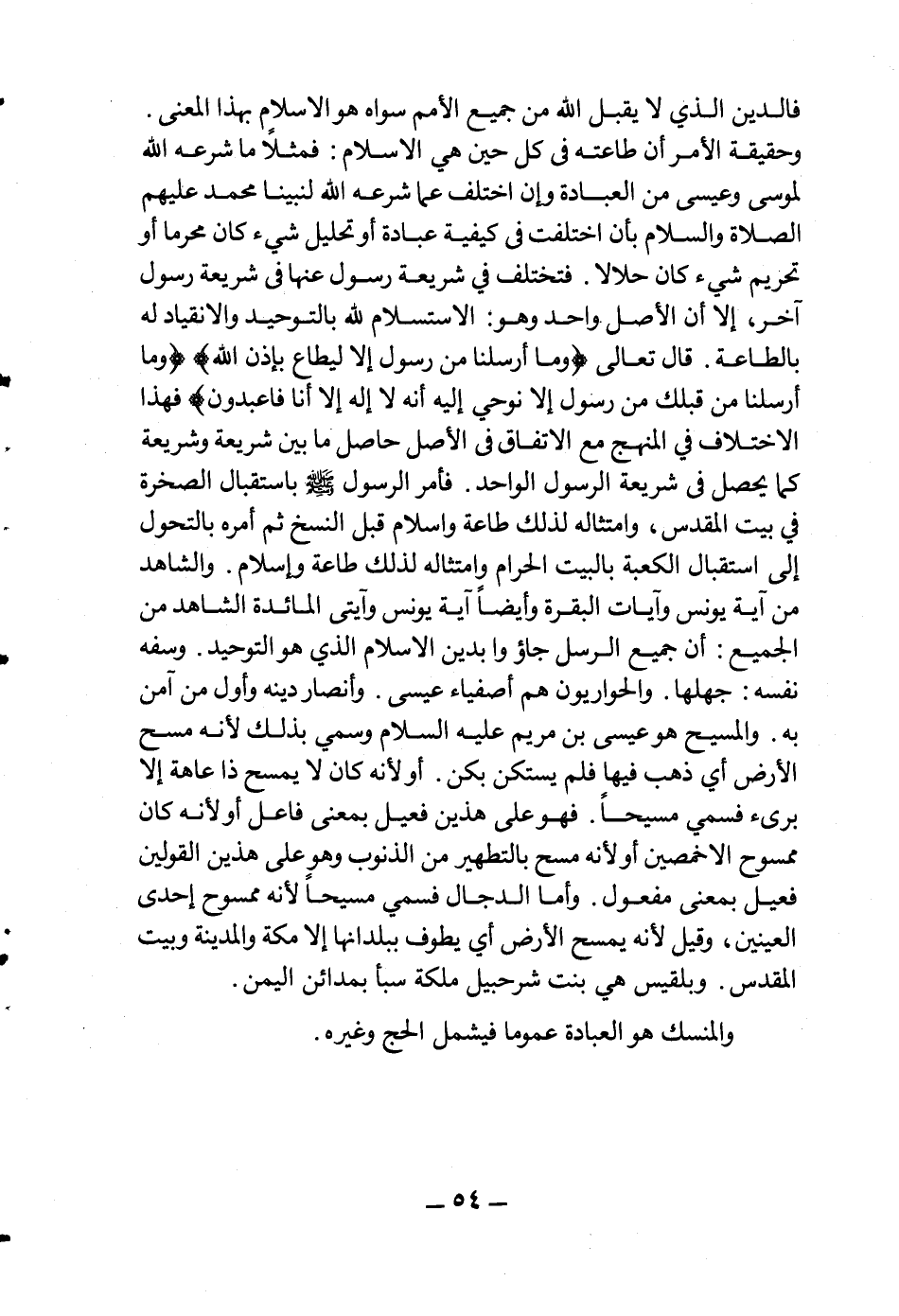 فالدين الذي لا يقبل الله من جميع الأمم سواه هو الإسلام بهذا المعنى. وحقيقة الأمر أن طاعته في كل حين هي الإسلام: فمثلا ما شرعه الله لموسى وعيسى من العبادة وإن اختلف عما شرعه الله لنبينا محمد عليهم الصلاة والسلام بأن اختلفت في كيفية عبادة أو تحليل شيء كان محرما أو تحريم شيء كان حلالا. فتختلف في شريعة رسول عنها في شريعة رسول آخر، إلا أن الأصل واحد وهو: الاستسلام لله بالتوحيد والانقياد له بالطاعة. قال تعالى {وَمَا أَرْسَلْنَا مِنْ رَسُولٍ إِلاَّ لِيُطَاعَ بِإِذْنِ اللَّه} ، {وَمَا أَرْسَلْنَا مِنْ قَبْلِكَ مِنْ رَسُولٍ إِلاَّ نُوحِي إِلَيْهِ أَنَّهُ لا إله إلا أَنَا فَاعْبُدُونِ} فهذا الاختلاف في المنهج مع الاتفاق في الأصل حاصل ما بين شريعة وشريعة كما يحصل في شريعة الرسول الواحد. فأمر الرسول صلى الله عليه وسلم باستقبال الصخرة في بيت المقدس، وامتثاله لذلك طاعة وإسلام قبل النسخ ثم أمره بالتحول إلى استقبال الكعبة بالبيت الحرام وامتثاله لذلك طاعة وإسلام. والشاهد من آية يونس وآيات البقرة وأيضا آية يونس وآيتي المائدة الشاهد من الجميع: أن جميع الرسل جاؤوا بدين الإسلام الذي هو التوحيد، وسفه نفسه: جهلها. والحواريون هم أصفياء عيسى وأنصار دينه وأول من آمن به. والمسيح هو عيسى بن مريم عليه السلام وسمي بذلك لأنه مسح الأرض أي ذهب فيها فلم يستكن بها، أو لأنه كان لا يمسح ذا عاهة إلا برئ فسمي مسيحا. فهو على هذين فعيل بمعنى فاعل أو لأنه كان ممسوح الأخمصين أو لأنه مسح بالتطهير من الذنوب وهو على هذين القولين فعيل بمعنى مفعول. وأما الدجال فسمي مسيحا لأنه ممسوح إحدى العينين، وقيل لأنه يمسح الأرض أي يطوف ببلدانها إلا مكة والمدينة وبيت المقدس. وبلقيس هي بنت شرحبيل ملكة سبأ بمدائن اليمن، والمنسك هو العبادة عموما فيشمل الحج وغيره.