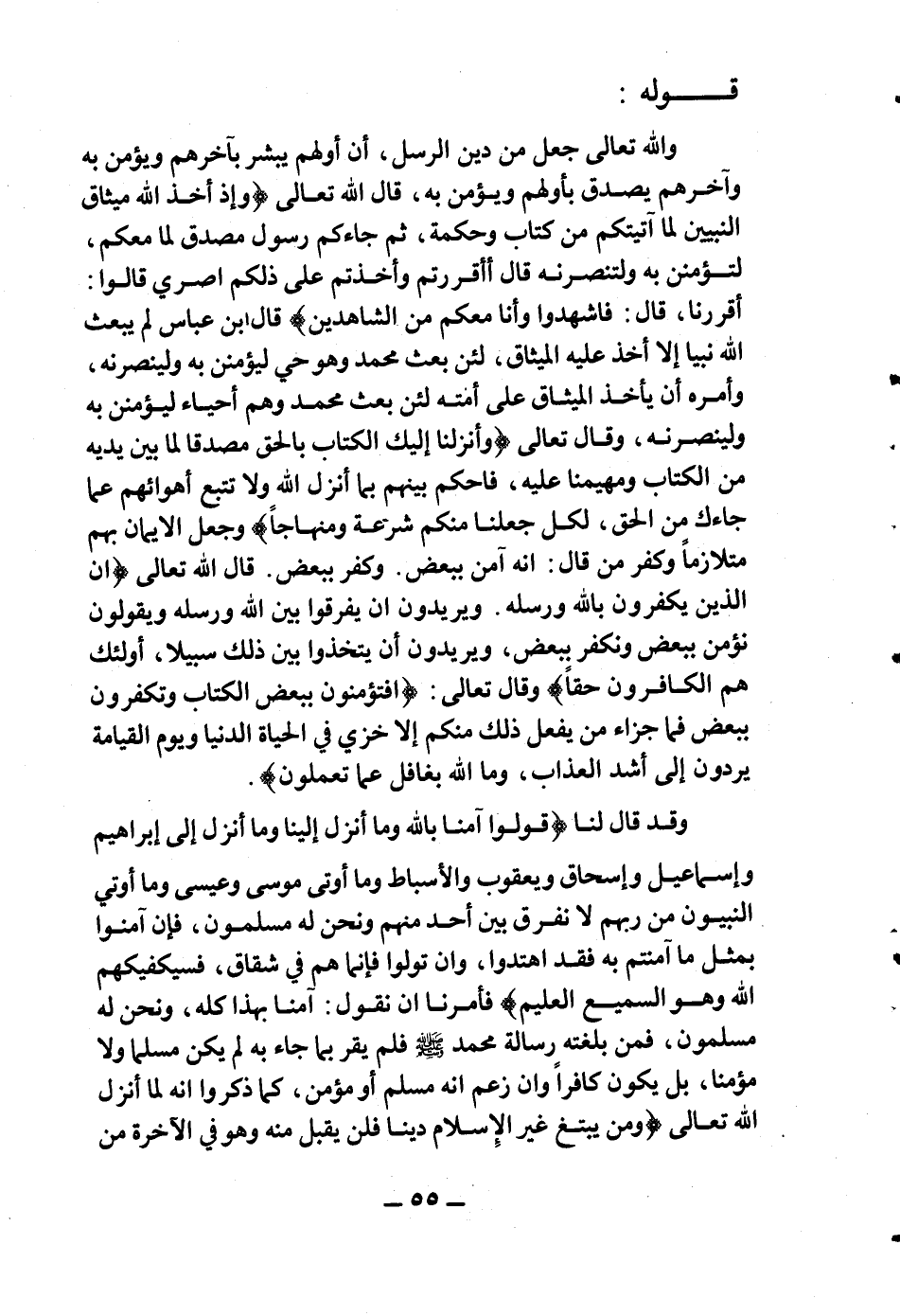 والله تعالى جعل من دين الرسل، أن أولهم يبشر بآخرهم ويؤمن به وآخرهم يصدق بأولهم ويؤمن به، قال الله تعالى: {وَإِذْ أَخَذَ اللَّهُ مِيثَاقَ النَّبِيِّينَ لَمَا آتَيْتُكُمْ مِنْ كِتَابٍ وَحِكْمَةٍ ثُمَّ جَاءَكُمْ رَسُولٌ مُصَدِّقٌ لِمَا مَعَكُمْ لَتُؤْمِنُنَّ بِهِ وَلَتَنْصُرُنَّهُ قَالَ أَأَقْرَرْتُمْ وَأَخَذْتُمْ عَلَى ذَلِكُمْ إِصْرِي قَالُوا أَقْرَرْنَا قَالَ فَاشْهَدُوا وَأَنَا مَعَكُمْ مِنَ الشَّاهِدِينَ} قال ابن عباس: لم يبعث الله نبيا إلا أخذ عليه الميثاق، لئن بعث محمد وهو حي ليؤمنن به ولينصرنه، وأمره أن يأخذ الميثاق على أمته لئن بعث محمد وهم أحياء ليؤمنن به ولينصرنه، وقال تعالى: {وَأَنْزَلْنَا إِلَيْكَ الْكِتَابَ بِالْحَقِّ مُصَدِّقاً لِمَا بَيْنَ يَدَيْهِ مِنَ الْكِتَابِ وَمُهَيْمِناً عَلَيْهِ فَاحْكُمْ بَيْنَهُمْ بِمَا أَنْزَلَ اللَّهُ وَلا تَتَّبِعْ أَهْوَاءَهُمْ عَمَّا جَاءَكَ مِنَ الْحَقِّ لِكُلٍّ جَعَلْنَا مِنْكُمْ شِرْعَةً وَمِنْهَاجاً} ، وجعل الإيمان بهم متلازما وكفر من قال: إنه آمن ببعض وكفر ببعض. قال الله تعالى: {إِنَّ الَّذِينَ يَكْفُرُونَ بِاللَّهِ وَرُسُلِهِ وَيُرِيدُونَ أَنْ يُفَرِّقُوا بَيْنَ اللَّهِ وَرُسُلِهِ وَيَقُولُونَ نُؤْمِنُ بِبَعْضٍ وَنَكْفُرُ بِبَعْضٍ وَيُرِيدُونَ أَنْ يَتَّخِذُوا بَيْنَ ذَلِكَ سَبِيلاً، أُولَئِكَ هُمُ الْكَافِرُونَ حَقّاً} ، وقال تعالى: {أَفَتُؤْمِنُونَ بِبَعْضِ الْكِتَابِ وَتَكْفُرُونَ بِبَعْضٍ فَمَا جَزَاءُ مَنْ يَفْعَلُ ذَلِكَ مِنْكُمْ إِلَّا خِزْيٌ فِي الْحَيَاةِ الدُّنْيَا وَيَوْمَ الْقِيَامَةِ يُرَدُّونَ إِلَى أَشَدِّ الْعَذَابِ وَمَا اللَّهُ بِغَافِلٍ عَمَّا تَعْمَلُونَ} .