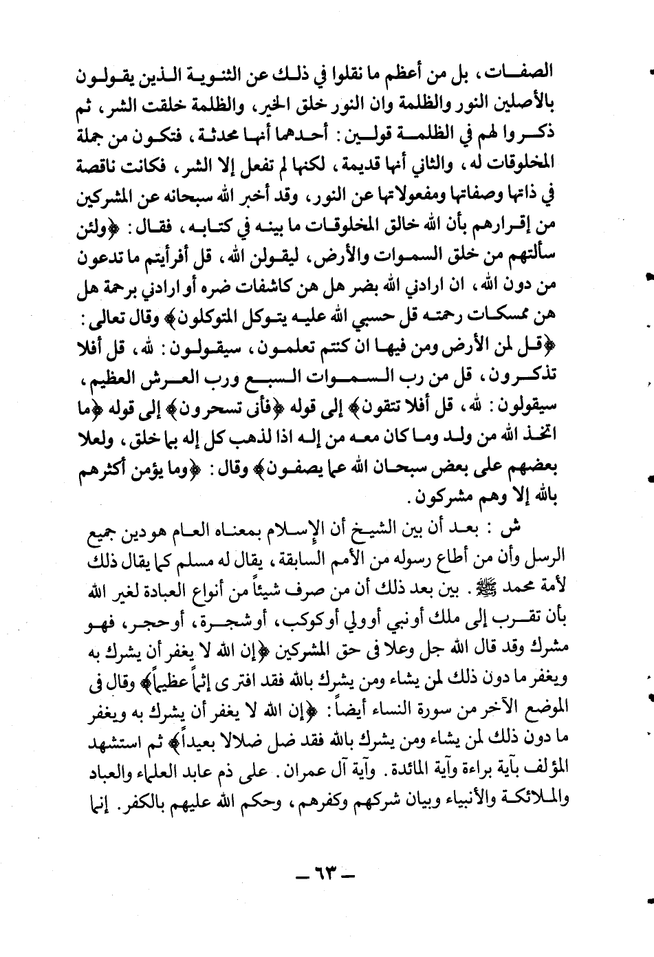 ش: بعد أن بين الشيخ أن الإسلام بمعناه العام هودين جميع الرسل وأن من أطاع رسوله من الأمم السابقة، يقال له مسلم كما يقال ذلك لأمة محمد صلى الله عليه وسلم. بين بعد ذلك أن من صرف شيئا من أنواع العبادة لغير لله بأن تقرب إلى ملك أو نبي أو ولي أو كوكب، أو شجرة، أو حجر، فهو مشرك وقد قال الله جل وعلا في حق المشركين {إِنَّ اللَّهَ لا يَغْفِرُ أَنْ يُشْرَكَ بِهِ وَيَغْفِرُ مَا دُونَ ذَلِكَ لِمَنْ يَشَاءُ وَمَنْ يُشْرِكْ بِاللَّهِ فَقَدِ افْتَرَى إِثْماً عَظِيماً} ، وقال في الموضع الآخر من سورة النساء أيضا: {إِنَّ اللَّهَ لا يَغْفِرُ أَنْ يُشْرَكَ بِهِ وَيَغْفِرُ مَا دُونَ ذَلِكَ لِمَنْ يَشَاءُ وَمَنْ يُشْرِكْ بِاللَّهِ فَقَدْ ضَلَّ ضَلالاً بَعِيداً} ، ثم استشهد المؤلف بآية براءة وآية المائدة وآية آل عمران على ذم عابد العلماء والعباد والملائكة والأنبياء وبيان شركهم وكفرهم، وحكم الله عليهم بالكفر إنما