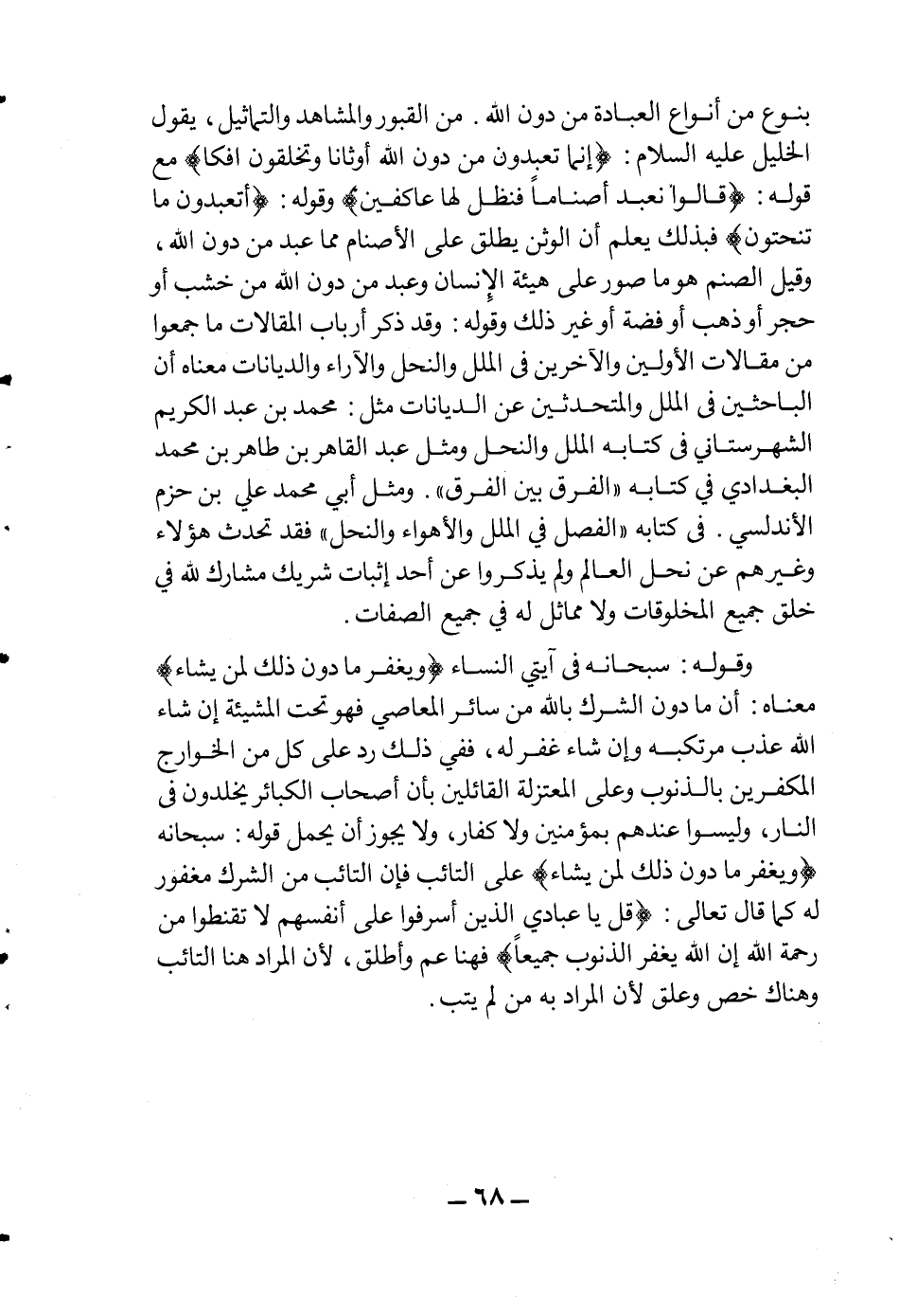 بنوع من أنواع العبادة من دون الله من القبور والمشاهد والتماثيل، يقول الخليل عليه السلام: {إِنَّمَا تَعْبُدُونَ مِنْ دُونِ اللَّهِ أَوْثَاناً وَتَخْلُقُونَ إِفْكاً} مع قوله: {قَالُوا نَعْبُدُ أَصْنَاماً فَنَظَلُّ لَهَا عَاكِفِينَ} ، وقوله: {أَتَعْبُدُونَ مَا تَنْحِتُون} فبذلك يعلم أن الوثن يطلق على الأصنام مما عبد من دون الله، وقيل الصنم هو ما صور على هيئة الإنسان وعبد من دون لله من خشب أو حجر أو ذهب أو فضة أو غير ذلك وقوله: وقد ذكر أرباب المقالات ما جمعوا من مقالات الأولين والآخرين في الملل والنحل والآراء والديانات معناه أن الباحثين في الملل والمتحدثين عن الديانات مثل: محمد بن عبد الكريم الشهرستاني في كتابه الملل والنحل ومثل عبد القاهر بن طاهر بن محمد البغدادي في كتابه "الفرق بين الفرق". ومثل أبي محمد علي بن حزم الأندلسي. في كتابه "الفصل في الملل والأهواء والنحل " فقد تحدث هؤلاء وغيرهم عن نحل العا لم ولم يذكروا عن أحد إثبات شريك مشارك لله في خلق جميع المخلوقات ولا مماثل له في جميع الصفات.