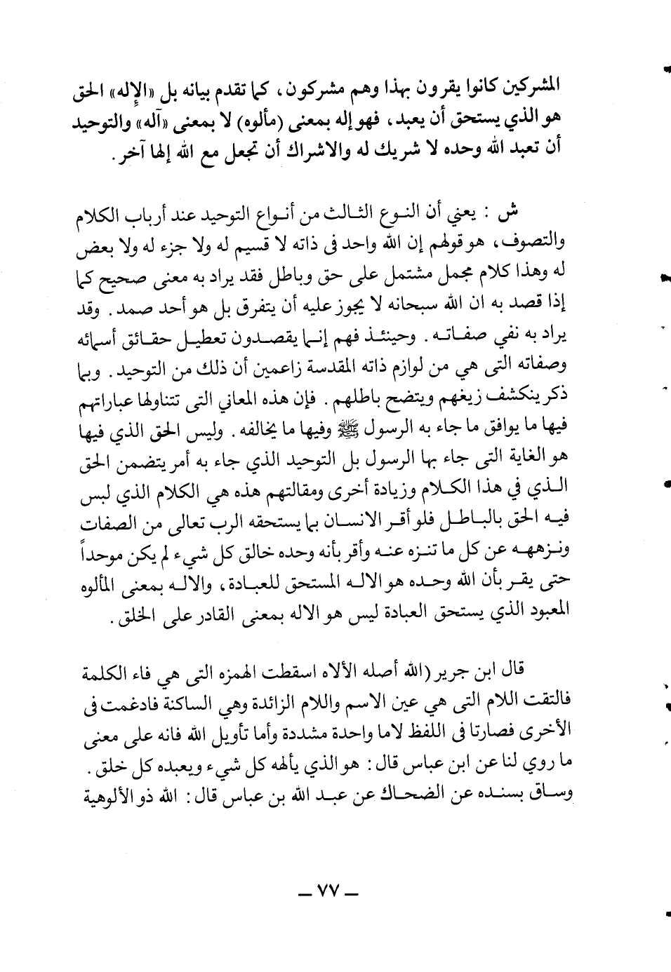 ش: يعني أن النوع الثالث من أنواع التوحيد عند أرباب الكلام والتصوف، هو قولهم أن لله واحد في ذاته لا قسيم له ولا جزء له ولا بعض له وهذا كلام مجمل مشتمل على حق وباطل فقد يراد به معنى صحيح كما إذا قصد به أن الله سبحانه لا يجوز عليه أن يتفرق بل هو أحد صمد. وقد يراد به نفي صفاته، وحينئذ فهم إنما يقصدون تعطيل حقائق أسمائه وصفاته التي هي من لوازم ذاته المقدسة زاعمين أن ذلك من التوحيد. وبما ذكر ينكشف زيغهم ويتضح باطلهم، فإن هذه المعاني التي تتناولها عباراتهم فيها ما يوافق ما جاء به الرسول صلى الله عليه وسلم وفيها ما يخالفه. وليس الحق الذي فيها هو الغاية التي جاء بها الرسول بل التوحيد الذي جاء به أمر يتضمن الحق الذي في هذا الكلام وزيادة أخرى، ومقالتهم هذه هي الكلام الذي لبس فيه الحق بالباطل فلو أقر الإنسان بما يستحقه الرب تعالى من الصفات ونزهه عن كل ما تنزه عنه وأقر بأنه وحده خالق كل شيء لم يكن موحدا حتى يقر بأن لله وحده هو الإله المستحق للعبادة، والإله بمعنى المألوه المعبود الذي يستحق العبادة ليس هو الإله بمعنى القادر على الخلق.