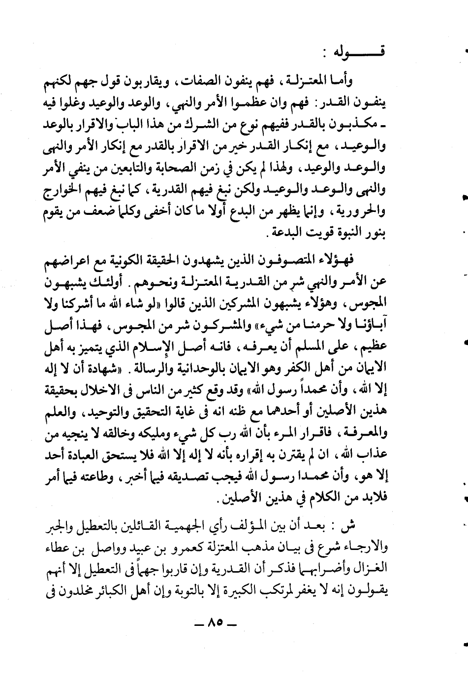 ش: بعد أن بين المؤلف رأي الجهمية القائلين بالتعطيل والجبر والإرجاء شرع في بيان مذهب المعتزلة كعمرو بن عبيد وواصل بن عطاء الغزال وأضرابهما فذكر أن القدرية وإن قاربوا جهما في التعطيل إلا أنهم يقولون أنه لا يغفر لمرتكب الكبيرة إلا بالتوبة وأن أهل الكبائر مخلدون في