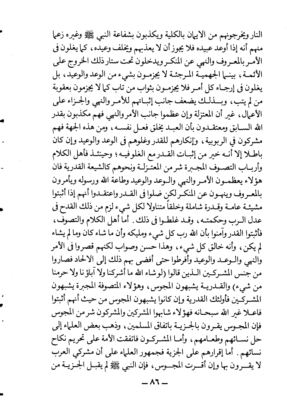 النار ويخرجونهم من الإيمان بالكلية ويكذبون بشفاعة النبي صلى الله عليه وسلم وغيره زعما منهم أنه إذا أوعد عبيده فلا يجوز أن لا يعذبهم ويخلف وعيده، كما يغلون في الأمر بالمعروف والنهي عن المنكر ويدخلون تحت ستار ذلك الخروج على الأئمة، بينما الجهمية المرجئة لا يجزمون بشيء من الوعد والوعيد، بل يغلون في إرجاء كل أمر فلا يجزمون بثواب من تاب كما لا يجزمون بعقوبة من لم يتب، وبذلك يضعف جانب إثباتهم للأمر والنهي والجزاء على الأعمال، غير أن المعتزلة وأن عظموا جانب الأمر والنهي فهم مكذبون بقدر الله السابق ومعتقدون بأن العبد يخلق فعل نفسه، ومن هذه الجهة فهم مشركون في الربوبية، وإنكارهم للقدر وغلوهم في الوعد والوعيد وإن كان باطلا إلا أنه خير من إثبات القدر مع الغلو فيه، وحينئذ فأهل الكلام وأرباب التصوف المجبرة شر من المعتزلة ونحوهم كالشيعة القدرية فإن هؤلاء يعظمون الأمر والنهي والوعد والوعيد وطاعة الله ورسوله ويأمرون بالمعروف وينهون عن المنكر لكن ضلوا في القدر واعتقدوا أنهم إذا أثبتوا مشيئة عامة وقدرة شاملة وخلقا متناولا لكل شيء لزم من ذلك القدح في عدل الرب وحكمته، وقد غلطوا في ذلك. أما أهل الكلام والتصوف، فأثبتوا القدر وآمنوا بأن الله رب كل شيء ومليكه وأن ما شاء كان وما لم يشأ لم يكن، وأنه خالق كل شيء، وهذا حسن وصواب لكنهم قصروا في الأمر والنهي والوعد والوعيد وأفرطوا حتى أفضى بهم ذلك إلى الإلحاد فصاروا من جنس المشركين الذين قالوا: {لَوْ شَاءَ اللَّهُ مَا أَشْرَكْنَا وَلا آبَاؤُنَا وَلا حَرَّمْنَا مِنْ شَيْءٍ} والقدرية يشبهون المجوس، وهؤلاء المتصوفة المجبرة يشبهون المشركين فأولئك القدرية وإن كانوا يشبهون المجوس من حيث أنهم أثبتوا فاعلا غير الله سبحانه فهؤلاء شابهوا المشركين والمشركون شر من المجوس فإن المجوس يقرون بالجزية باتفاق المسلمين، وذهب بعض العلماء إلى حل نسائهم وطعامهم، وأما المشركون فاتفقت الأمة على تحريم نكاح نسائهم. أما إقرارهم على الجزية فجمهور العلماء على أن مشركي العرب لا يقرون بها وإن أقرت المجوس، فإن النبي صلى الله عليه وسلم لم يقبل الجزية من