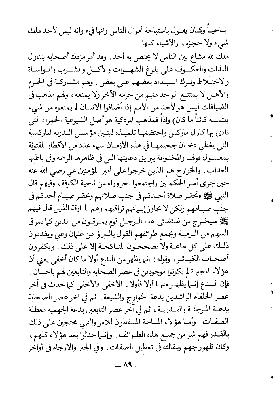 إباحيا وكان يقول باستباحة أموال الناس وأنها فيء وأنه ليس لأحد ملك شيء ولا حجزه، والأشياء كلها ملك لله مشاع بين الناس لا يختص به أحد. وقد أمر مزدك أصحابه بتناول اللذات والعكوف على بلوغ الشهوات والأكل والشرب والمواساة والاختلاط وترك استبداد بعضهم على بعض. ولهم مشاركة في الحرم والأهل لا يمتنع الواحد منهم من حرمة الآخر ولا يمنعه، ولهم مذهب في الضيافات ليس هو لأحد من الأمم إذا أضافوا الإنسان لم يمنعوه من شيء يلتمسه كائنا ما كان"، وإذاً فمذهب المزدكية هو أصل الشيوعية الحمراء التي نادى بها كارل ماركس واحتضنها تلميذه لينين مؤسس الدولة الماركسية التي يغطي دخان جحيمها في هذه الأزمان سماء عدد من الأقطار المفتونة بمعسول قولها والمخدوعة ببريق دعايتها التي في ظاهرها الرحمة وفى باطنها العذاب. والخوارج هم الذين خرجوا على أمير المؤمنين علي رضي الله عنه حين جرى أمر الحكمين واجتمعوا بحروراء من ناحية الكوفة، وفيهم قال النبي صلى الله عليه وسلم: "تحقر صلاة أحدكم في جنب صلاتهم ويحقر صيام أحدكم في جنب صيامهم ولكن لا يجاوز إيمانهم تراقيهم"، وهم المارقة الذين قال فيهم صلى الله عليه وسلم: "سيخرج من ضئضئ هذا الرجل قوم يمرقون من الدين كما يمرق السهم من الرمية"، ويجمع طوائفهم القول بالتبرؤ من عثمان وعلي ويقدمون ذلك على كل طاعة ولا يصححون المناكحة إلا على ذلك. ويكفرون أصحاب الكبائر. وقوله: "غنما يظهر من البدع أولا ما كان أخفى" يعني أن هؤلاء المجبرة لم يكونوا موجودين في عصر الصحابة والتابعين لهم بإحسان، فإن البدع إنما يظهر منها أولا فأولا الأخفى فالأخفى، كما حدث في آخر عصر الخلفاء الراشدين بدعة الخوارج والشيعة. ثم في آخر عصر الصحابة بدعة المرجئة والقدرية، ثم في آخر عصر التابعين بدعة الجهمية معطلة الصفات. وأما هؤلاء المباحة المسقطون للأمر والنهي محتجين على ذلك بالقدر فهم شر من جميع هذه الطوائف، وإنما حدثوا بعد هؤلاء كلهم، وكان ظهور جهم ومقالته في تعطيل الصفات وفي الجبر والإرجاء في أواخر