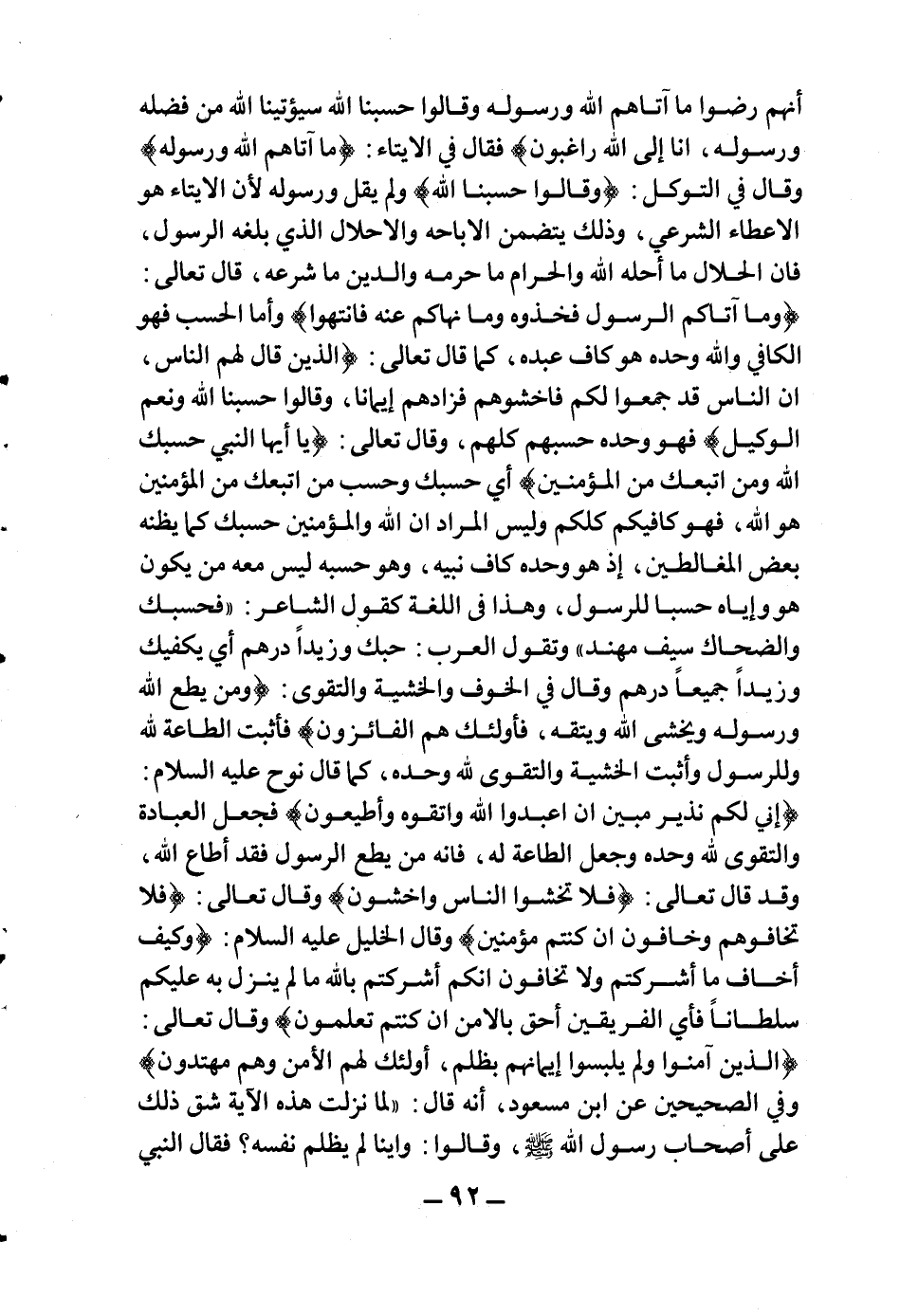 أَنَّهُمْ رَضُوا مَا آتَاهُمُ اللَّهُ وَرَسُولُهُ وَقَالُوا حَسْبُنَا اللَّهُ سَيُؤْتِينَا اللَّهُ مِنْ فَضْلِهِ وَرَسُولُهُ إِنَّا إِلَى اللَّهِ رَاغِبُونَ} ، فقال في الإيتاء: {مَا آتَاهُمُ اللَّهُ وَرَسُولُهُ} ، وقال في التوكل: {وَقَالُوا حَسْبُنَا اللَّهُ} ولم يقل (ورسوله) أن الإيتاء هو الإعطاء الشرعي، وذلك يتضمن الإباحة والإحلال الذي بلغه الرسول، فإن الحلال ما أحله الله والحرام ما حرمه والدين ما شرعه، قال تعالى: {وَمَا آتَاكُمُ الرَّسُولُ فَخُذُوهُ وَمَا نَهَاكُمْ عَنْهُ فَانْتَهُوا} ، وأما الحسب فهو الكافي والله وحده هو كاف عبده، كما قال تعالى: {الَّذِينَ قَالَ لَهُمُ النَّاسُ إِنَّ النَّاسَ قَدْ جَمَعُوا لَكُمْ فَاخْشَوْهُمْ فَزَادَهُمْ إِيمَاناً وَقَالُوا حَسْبُنَا اللَّهُ وَنِعْمَ الْوَكِيلُ} فهو وحده حسبهم كلهم، وقال تعالى: {يَا أَيُّهَا النَّبِيُّ حَسْبُكَ اللَّهُ وَمَنِ اتَّبَعَكَ مِنَ الْمُؤْمِنِينَ} أي حسبك وحسب من اتبعك من المؤمنين هو الله، فهو كافيكم كلكم وليس المراد أن الله والمؤمنين حسبك كما يظنه بعض المغالطين، إذ هو وحده كاف نبيه، وهو حسبه ليس معه من يكون هو وإياه حسبا للرسول، وهذا في اللغة كقول الشاعر: "فحسبك والضحاك سيف مهند"، وتقول العرب: "حسبك وزيدا درهم" أي يكفيك وزيدا جميعا درهم وقال في الخوف والخشية والتقوى: {وَمَنْ يُطِعِ اللَّهَ وَرَسُولَهُ وَيَخْشَ اللَّهَ وَيَتَّقْهِ فَأُولَئِكَ هُمُ الْفَائِزُونَ} فأثبت الطاعة لله وللرسول وأثبت الخشية والتقوى لله وحده، كما قال نوح عليه السلام: {إِنِّي لَكُمْ نَذِيرٌ مُبِينٌ أَنِ اعْبُدُوا اللَّهَ وَاتَّقُوهُ وَأَطِيعُونِ} فجعل العبادة والتقوى لله وحده وجعل الطاعة له، فإنه من يطع الرسول فقد أطاع الله، وقد قال تعالى: {فَلا تَخْشَوُا النَّاسَ وَاخْشَوْنِ} ، وقال تعالى: {فَلا تَخَافُوهُمْ وَخَافُونِ إِنْ كُنْتُمْ مُؤْمِنِينَ} ، وقال الخليل عليه السلام: {وَكَيْفَ أَخَافُ مَا أَشْرَكْتُمْ وَلا تَخَافُونَ أَنَّكُمْ أَشْرَكْتُمْ بِاللَّهِ مَا لَمْ يُنَزِّلْ بِهِ عَلَيْكُمْ سُلْطَاناً فَأَيُّ الْفَرِيقَيْنِ أَحَقُّ بِالْأَمْنِ إِنْ كُنْتُمْ تَعْلَمُونَ} ، وقال تعالى: {الَّذِينَ آمَنُوا وَلَمْ يَلْبِسُوا إِيمَانَهُمْ بِظُلْمٍ أُولَئِكَ لَهُمُ الْأَمْنُ وَهُمْ مُهْتَدُونَ} . وفي الصحيحين عن ابن مسعود أنه قال: "لما نزلت هذه الآية شق ذلك على أصحاب رسول الله صلى الله عليه وسلم وقالوا: وأينا لم يظلم نفسه؟، فقال النبي
