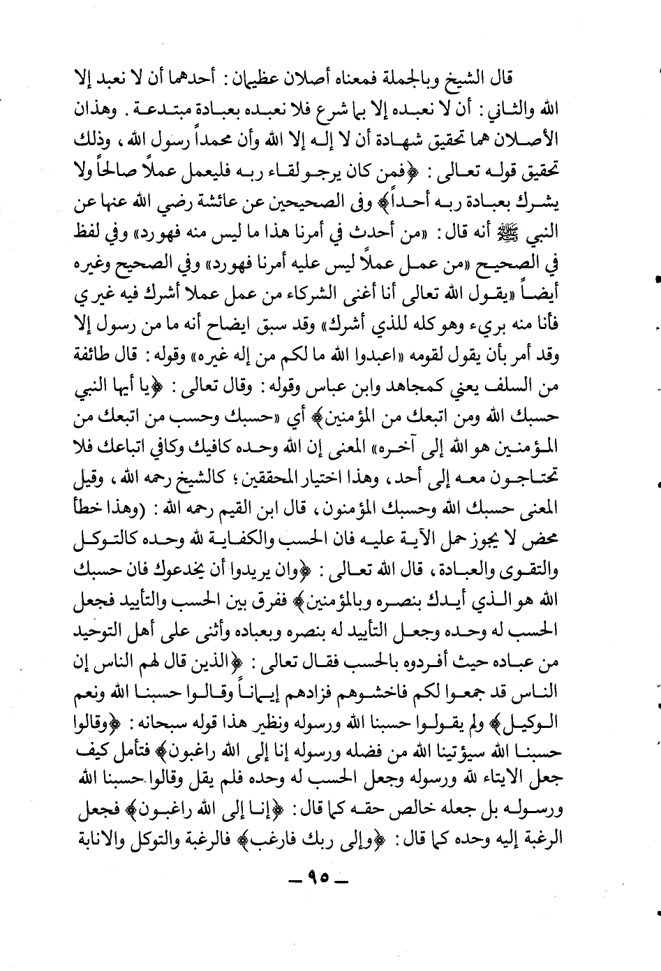 قال الشيخ: وبالجملة فمعناه أصلان عظيمان: أحدهما أن لا نعبد إلا الله، والثاني: أن لا نعبده إلا بما شرع فلا نعبده بعبادة مبتدعة. وهذان الأصلان هما تحقيق شهادة أن لا إله إلا الله وأن محمدا رسول الله، وذلك تحقيق قوله تعالى: {فَمَنْ كَانَ يَرْجُوا لِقَاءَ رَبِّهِ فَلْيَعْمَلْ عَمَلاً صَالِحاً وَلا يُشْرِكْ بِعِبَادَةِ رَبِّهِ أَحَداً} ، وفي الصحيحين عن عائشة رضي الله عنها عن النبي صلى الله عليه وسلم أنه قال: "من أحدث في أمرنا هذا ما ليس منه فهو رد"، وفي لفظ في الصحيح "من عمل عملا ليس عليه أمرنا فهو رد"، وفي الصحيح وغيره أيضا "يقول لله تعالى أنا أغنى الشركاء من عمل عملا أشرك فيه غيري فأنا منه بريء وهو كله للذي أشرك"، وقد سبق إيضاح أنه ما من رسول إلا وقد أمر بأن يقول لقومه {اعْبُدُوا اللَّهَ مَا لَكُمْ مِنْ إِلَهٍ غَيْرُهُ} ، وقوله: "قال طائفة من السلف" يعني كمجاهد وابن عباس وقوله: "وقال تعالى: {يَا أَيُّهَا النَّبِيُّ حَسْبُكَ اللَّهُ وَمَنِ اتَّبَعَكَ مِنَ الْمُؤْمِنِينَ} أي "حسبك وحسب من اتبعك من المؤمنين هو الله إلى آخره " المعنى أن الله وحده كافيك وكافي أتباعك فلا تحتاجون معه إلى أحد، وهذا اختيار المحققين كالشيخ رحمه الله، وقيل المعنى حسبك الله وحسبك المؤمنون، قال ابن القيم رحمه الله: "وهذا خطأ محض لا يجوز حمل الآية عليه فإن الحسب والكفاية لله وحده كالتوكل والتقوى والعبادة، قال الله تعالى: {وَإِنْ يُرِيدُوا أَنْ يَخْدَعُوكَ فَإِنَّ حَسْبَكَ اللَّهُ هُوَ الَّذِي أَيَّدَكَ بِنَصْرِهِ وَبِالْمُؤْمِنِينَ} ، ففرق بين الحسب والتأييد فجعل الحسب له وحده وجعل التأييد له بنصره وبعباده وأثنى على أهل التوحيد من عباده حيث أفردوه بالحسب فقال تعالى: {الَّذِينَ قَالَ لَهُمُ النَّاسُ إِنَّ النَّاسَ قَدْ جَمَعُوا لَكُمْ فَاخْشَوْهُمْ فَزَادَهُمْ إِيمَاناً وَقَالُوا حَسْبُنَا اللَّهُ وَنِعْمَ الْوَكِيلُ} ولم يقولوا حسبنا الله ورسوله ونظير هذا قوله سبحانه: {وَقَالُوا حَسْبُنَا اللَّهُ سَيُؤْتِينَا اللَّهُ مِنْ فَضْلِهِ وَرَسُولُهُ إِنَّا إِلَى اللَّهِ رَاغِبُونَ} ، فتأمل كيف جعل الإيتاء لله ورسوله وجعل الحسب له وحده فلم يقل وقالوا حسبنا الله ورسوله بل جعله خالص حقه كما قال: {إِنَّا إِلَى اللَّهِ رَاغِبُونَ} فجعل الرغبة إليه وحده كما قال: {وَإِلَى رَبِّكَ فَارْغَبْ} ، فالرغبة والتوكل والإنابة