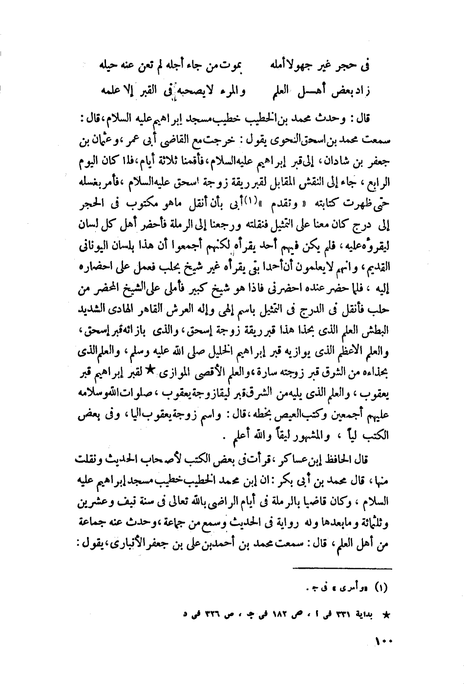 قال: وحدث محمد بن الخطب خطب مسجد إبراهيم عليه السلام، قال: سمعت محمد بن إسحاق النحوي يقول: خرجت مع القاضي أبي عمر، وعثمان بن جعفر بن شادان، إلى قبر إبراهيم عليه السلام: فأقمنا ثلاثة أيام، فلما كان اليوم الرابع، جاء إلى النقش المقابل لقبر ريقة زوجة إسحاق عليه السلام، فأمر بغسله حتى ظهرت كتابته وتقدم وأمر أبي بأن أنقل ما هو مكتوب في الحجر إلى درج كان معنا على التمثيل فنقلته ورجعنا إلى الرملة فأحضر أهل كل لسان ليقرؤوه عليه، فلم يكن فيهم أحد يقرؤه لكنهم أجمعوا أن هذا بلسان اليوناني القديم، وأنهم لا يعلمون أن أحدًا بقي يقرؤه غير شيخ بحلب فعمل على إحضاره إليه، فلما حضر عنده أحضرني فإذا هو شيخ كبير فأملى على الشيخ المحضر من حلب فأنقل في الدرج في التمثيل باسم إلهى وإله العرش القاهر الهادي الشديد البطش، العلم الذي بحذا هذا قبر ريقة زوجة إسحاق، والذي بإزائه قبر إسحاق، والعلم الأعظم الذي يوازيه قبر إبراهيم الخليل -صلى اللَّه عليه وسلم-، والعلم الذي بحذائه من الشرق قبر زوجته سارة، والعلم الأقصى الموازي لقبر إبراهيم قبر يعقوب، والعلم الذي يليه من الشرق قبر ليقا زوجة يعقوب، صلوات اللَّه وسلامه عليهم أجمعين، وكتب العيص بخطه، قال: واسم زوجة يعقوب إليا، وفي بعض الكتب ليا، والمشهور ليقا واللَّه أعلم.