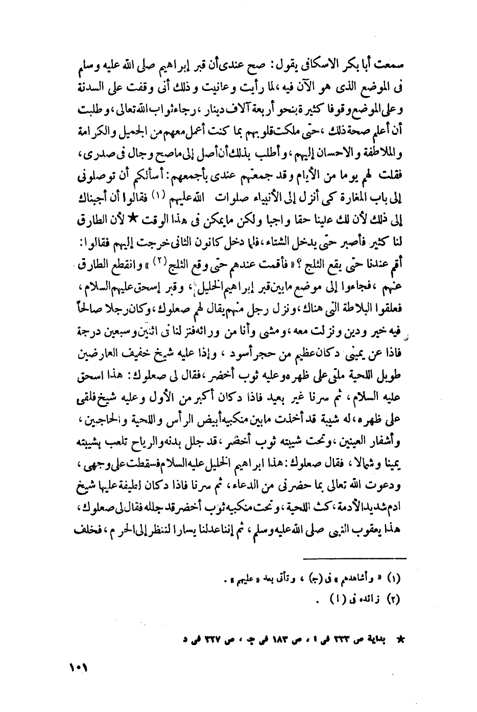 سمعت أبا بكر الإسكافي يقول: صح عندي أن قبر إبراهيم -صلى اللَّه عليه وسلم- في الموضع الذي هو الآن فيه، لما رأيت وعانيت وذلك أني وقفت على السدنة وعلى الموضع وقوفًا كثيرة بنحو أربعة آلاف دينار، رجاء ثواب اللَّه تعالى، وطلبت أن أعلم صحة ذلك، حتى ملكت قلوبهم بما كنت أعمل معهم من الجميل والكرامة والملاطفة والإحسان إليهم، وأطلب بذلك أن أصل إلى ما صح وجال في صدري، فقلت لهم يومًا من الأيام وقد جمعتهم عندي بأجمعهم: أسألكم أن توصلوني إلى باب المغارة كي أنزل إلى الأنبياء صلوات اللَّه عليهم وأشاهدهم فقالوا إن أجبناك إلى ذلك لأن لك علينا حقًا واجبًا ولكن ما يمكن في هذا الوقت لأن الطارق لنا كثير فاصبر حتى يدخل الشتاء فلما دخل كانون الثاني خرجت إليهم فقالوا: أقم عندنا حتى يقع الثلج؟ فأقمت عندهم حتى وقع الثلج وانقطع الطارق عنهم فجاءوا إلى موضع ما بين قبر إبراهيم الخليل، وقبر إسحاق عليهم السلام، فعلقوا البلاطة التي هناك، ونزل رجل منهم يقال له صعلوك، وكان رجلًا صالحًا فيه خير ودين ونزلت معه، ومشى وأنا من ورائه فنزلنا في اثنتين وسبعين درجة فإذا عن يميني دكان عظيم من حجر أسود، وإذا عليه شيخ خفيف العارضين طويل اللحية ملقى على ظهره وعليه ثوب أخصر، فقال لي صعلوك، هذا إسحاق عليه السلام، ثم سرنا غير بعيد فإذا دكان أكبر من الأول وعليه شيخ ملقى على ظهره، له شيبة قد أخذت ما بين منكبيه أبيض الرأس واللحية والحاجبين وأشفار العينين، وتحت شيبته ثوب أخصر، قد جلل بدنه والرياح تلعب بشيبته يمينًا وشمالًا، فقال صعلوك: هذا إبراهيم الخليل عليه السلام فسقطت على وجهي ودعوت اللَّه تعالى بما حضرني من الدعاء، ثم سرنا فإذا دكان لطيفة عليها شيخ آدم شديد الأدمة، كث اللحية، وتحت منكبيه ثوب أخضر قد جلله فقال لي صعلوك، هذا يعقوب النبي -صلى اللَّه عليه وسلم-، ثم إننا عدلنا يسارًا لننظر إلى الحرم، فخلف