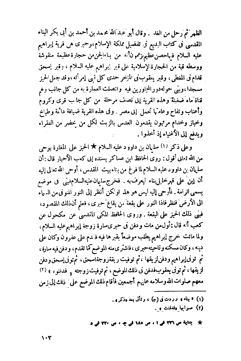 الظهر ثم رحل من الغد، وقال أبو عبد اللَّه بن محمد بن أحمد بن أبي بكر البناء المقدسي في كتاب البديع في تفضيل مملكة الإسلام، وحبرى هي قرية إبراهيم عليه السلام فيها حصن عظيم يزعمون أنه من بناء الجن من حجارة عظيمة منقوشة ووسطه قبة من الحجارة الإسلامية على قبر إبراهيم عليه السلام، وقبر إسحاق قدام في المغطى، وقبر يعقوب في المؤخر حدى كل نبي امرأته، وقد جعل الحيز مسجدًا وبنى حوله دور المجاورين فيه واتصلت العمارة به من كل جانب ولهم قناة ماء ضغينة وهذه القرية إلى نصف مرحلة من كل جانب قرى وكروم وأعناب وتفاح وعامتها تحمل إلى مصر. وفي هذه القرية ضيافه دائمة وطباخ وخباز وخدام مرتبون يقدمون العدس بالزيت لكل من يحضر من الفقراء ويدفع إلى الأغنياء إذا أخذوا.