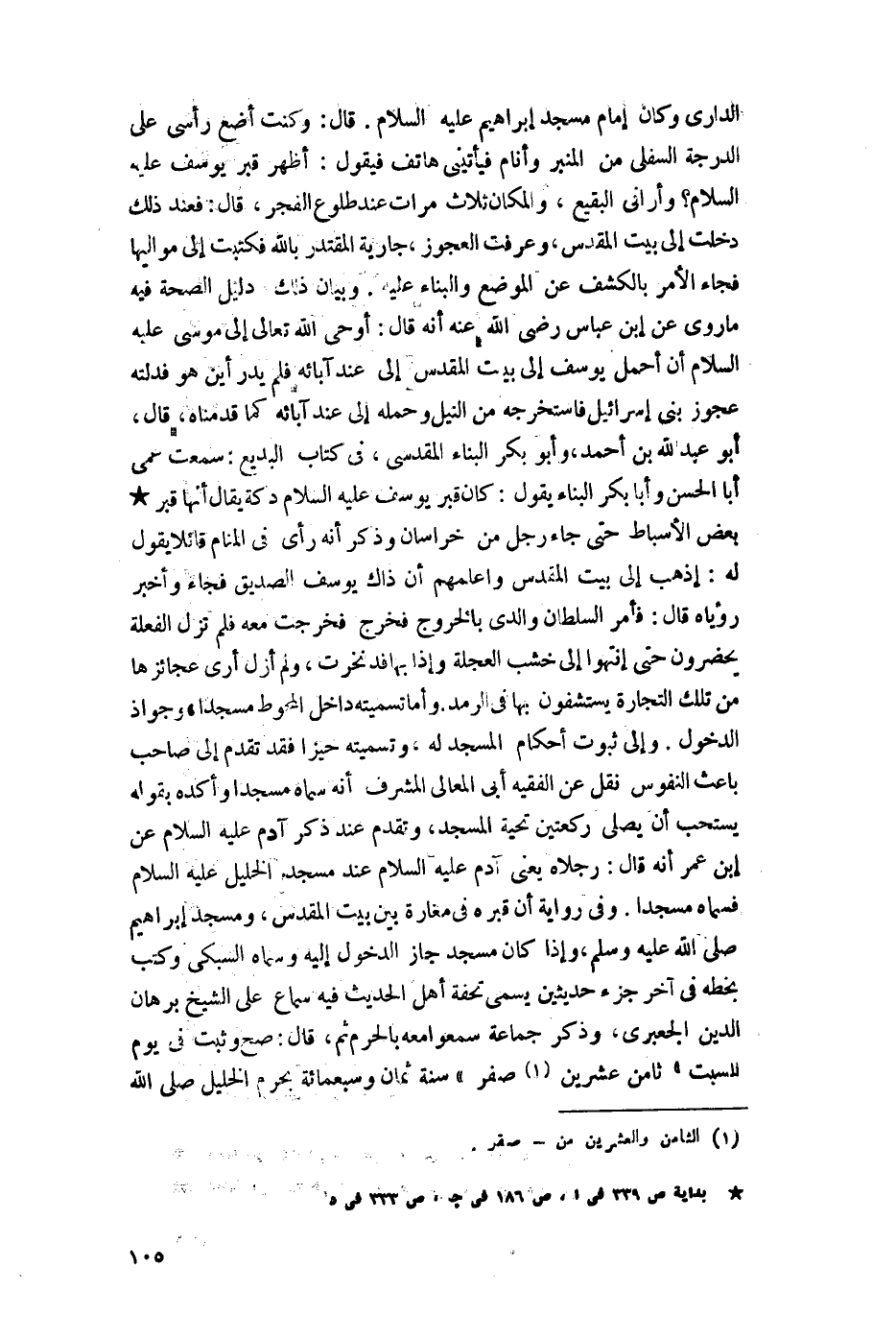 الداري وكان إمام مسجد إبراهيم عليه السلام، قال: وكنت أضع رأسي على الدرجة السفلى من المنبر وأنام فيأتيني هاتف يقول: أظهر قبر يوسف عليه السلام وأراني البقيع، والمكان ثلاث مرات عند طلوع الفجر قال فعند ذلك دخلت إلى بيت المقدس، وعرفت العجوز جارية المقتدر باللَّه فكتبت إلى مواليها فجاء الأمر بالكشف عن الموضع والبناء عليه، وبيان ذلك دليل الصحة فيه ما روي عن ابن عباس رضي اللَّه عنه أنه قال: أوحى اللَّه تعالى إلى موسى عليه السلام أن احمل يوسف إلى بيت المقدس إلى عند آبائه فلم يدر أين هو فدلته عجوز بني إسرائيل فاستخرجه من النيل وحمله إلى عند آبائه كما قدمناه، قال: أبو عبد اللَّه بن أحمد وأبو بكر البناء المقدسي، في كتاب البديع: سمعت عمي أبا الحسن وأبا بكر البناء يقولان: كان قبر يوسف عليه السلام دكة يقال إنها قبر بعض الأسباط حتى جاء رجل من خراسان وذكر أنه رأى في المنام قائلًا يقول له: اذهب إلى بيت المقدس وأعلمهم أن ذاك يوسف الصديق فجاء وأخبر رؤياه قال: فأمر السلطان والدي بالخروج فخرج فخرجت معه فلم تزل الفعلة يحضرون حتى انتهوا إلى خشب العجلة وإذا بها قد نخرت، ولم أزل أرى عجائزها من تلك التجارة يستشفون بها في الرمد وأما تسميته داخل المحوط مسجدا، وجواز الدخول، وإلى ثبوت أحكام المسجد له، وتسميته حيزا فقد تقدم إلى صاحب باعث النفوس نقل عن الفقيه أبي المعالي المشرف أنه سماه مسجدًا وأكده بقوله يستحب أن يصلى ركعتين تحية المسجد، وتقدم عند ذكر آدم عليه السلام عن ابن عمر أنه قال: رجلاه يعني آدم عليه