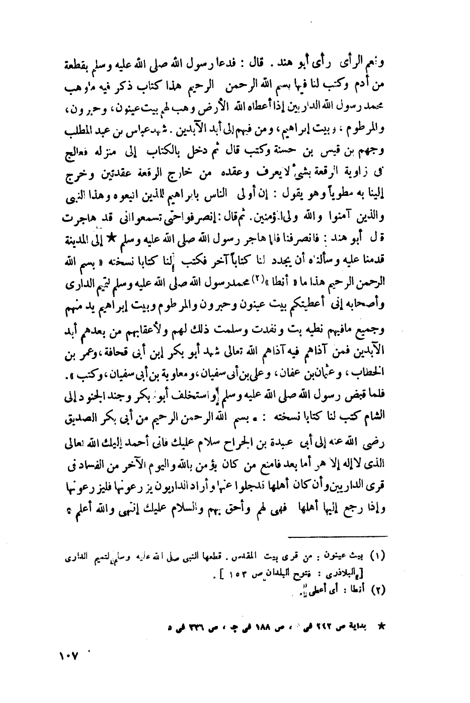 ونعم الرأي رأي أبو هند، قال: فدعا رسول اللَّه -صلى اللَّه عليه وسلم- بقطعة من أدم وكتب لنا فيها بسم اللَّه الرحمن الرحيم هذا كتاب ذكر فيه ما وهب محمد رسول اللَّه -صلى اللَّه عليه وسلم- الداريين إذا أعطاه اللَّه الأرض وهب لهم بيت عينون، وحبرون، والمرطوم، وبيت إبراهيم، ومن فيهم إلى أبد الآبدين، شهد عباس بن عبد المطلب وجهم بن قيس بن حسنة وكتب قال ثم دخل بالكتاب إلى منزله فعاج في زاوية الرقعة بشيء لا يعرف وعقده من خارج الرقعة عقدتين وخرج إلينا به مطويًا وهو يقول: {إِنَّ أَوْلَى النَّاسِ بِإِبْرَاهِيمَ لَلَّذِينَ اتَّبَعُوهُ وَهَذَا النَّبِيُّ وَالَّذِينَ آمَنُوا وَاللَّهُ وَلِيُّ الْمُؤْمِنِينَ} [آل عمران: 68] , ثم قال: انصرفوا حتى تسمعوا أني قد هاجرت قال أبو هند: فانصرفنا فلما هاجر رسول اللَّه -صلى اللَّه عليه وسلم- إلى المدينة قدمنا عليه وسألناه أن يجدد لنا كتابا آخر فكتب لنا كتابًا نسخته بسم اللَّه الرحمن الرحيم هذا ما أعطى محمد رسول اللَّه -صلى اللَّه عليه وسلم- لتميم الداري وأصحابه إني أعطيتكم بيت عينون وحبرون والمرطوم وبيت إبراهيم يد منهم وجميع ما فيهم عطية بت ونفدت وسلمت ذلك لهم ولأعقابهم من بعدهم أبد الآبدين فمن آذاهم فيه آذاهم اللَّه تعالى شهد أبو بكر بن أبي قحافة، وعمر بن الخطاب، وعثمان بن عفان، وعلي بن أبي طالب، ومعاوية بن أبي سفيان، وكتب، فلما قبض رسول اللَّه -صلى اللَّه عليه وسلم- واستخلف أبو بكر وجند جنود إلى الشام كتب لنا كتابًا نسخته: بسم اللَّه الرحمن الرحيم من أبي بكر الصديق -رضي اللَّه عنه- إلى أبي عبيدة بن الجراح سلام عليك فإني أحمد إليك اللَّه تعالى الذي لا إله إلا هو أما بعد فامنع من كان يؤمن باللَّه واليوم الآخر من الفساد في قرى الداريين وإن كان أهلها قد جلوا عنها وأراد الداريون أن يزرعوها فليزرعوها وإذا رجع إليها أهلها فهي لهم وأحق بهم والسلام عليك انتهى واللَّه أعلم.