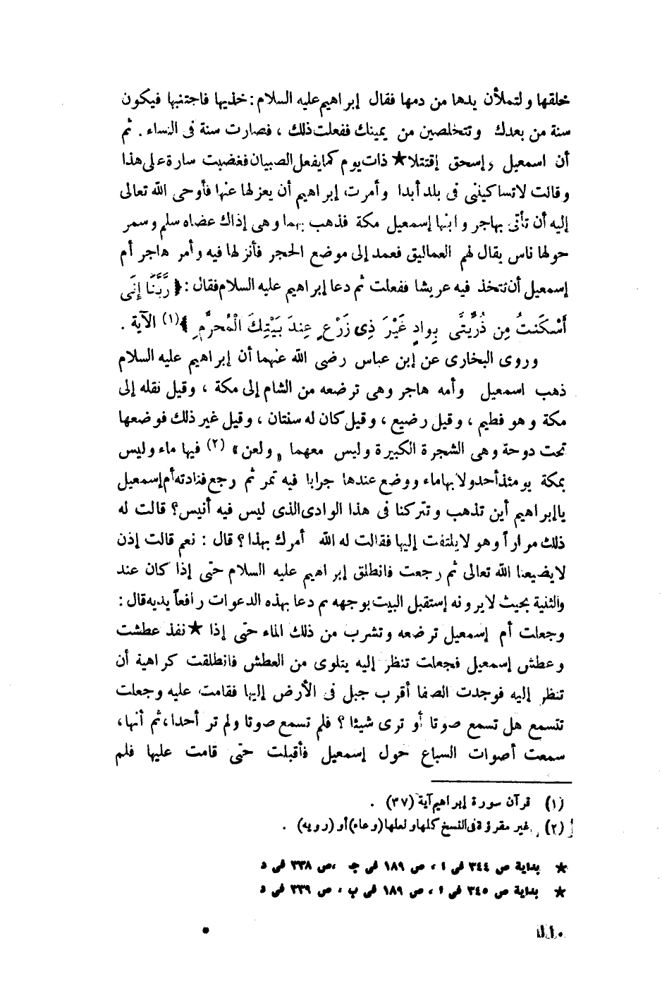 وروى البخاري عن ابن عباس رضي اللَّه عنهما أن إبراهيم عليه السلام ذهب بإسماعيل وأمه هاجر وهي ترضعه من الشام إلى مكة، وقيل نقله إلى مكة وهو فطيم، وقيل: رضيع، وقيل: كان له سنتان، وقيل غير ذلك فوضعها تحت دوحة وهي الشجرة الكبيرة وليس معهما وعاء فيها ماء وليس بمكة يومئذٍ أحد ولا بها ماء ووضع عندها جرابا فيه تمر ثم رجع فنادته أم إسماعيل يا إبراهيم أين تذهب وتتركنا في هذا الوادي الذي ليس فيه أنيس؟ قالت له ذلك مرارًا وهو لا يلتفت إليها فقالت له: آللَّه أمرك بهذا؟ قال: نعم. قالت: إذًا لا يضيعنا اللَّه تعالى ثم رجعت فانطلق إبراهيم عليه السلام حتى إذا كان عند الثنية بحيث لا يرونه استقبل البيت بوجهه ثم دعا بهذه الدعوات رافعًا يديه.