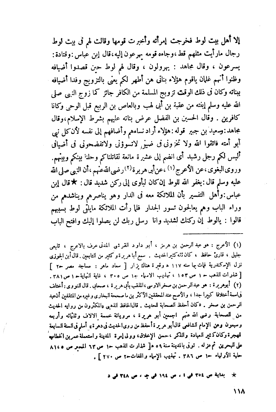 لهم في بيت لوط رجال ما رأيت مثلهم قط، وجاءه قومه يهرعون إليه، قال ابن عباس، وقتادة يسرعون، وقال مجاهد: يهرولون، وقال لهم لوط حين قصدوا أضيافه وظنوا أنهم غلمان يا قوم هؤلاء بناتي هن أطهر لكم يعني بالتزويج وفدا أضيافه ببناته وكان في ذلك الوقت تزويج المسلمة من الكافر جائز كما زوج النبي -صلى اللَّه عليه وسلم- بنتيه من عقبة بن أبي لهب وبالعاص بن الربيع قبل الوحي وكانا كافرين، وقال الحسين بن الفضل عرض بناته عليهم بشرط الإِسلام، وقال مجاهد وسعيد بن جبير قوله: هؤلاء أراد نساءهم وأضافهم إلى نفسه لأن كل نبي أبو أمته فاتقوا اللَّه ولا تخزوني في ضيفي لا تسوؤني ولا تفضحوني في أضيافي {أَلَيْسَ مِنْكُمْ رَجُلٌ رَشِيدٌ} [هود: 78] أي انضم إلى عشيرة مانعة لقاتلناكم وحُلنا بينكم وبينهم وروى البغوي، عن الأعرج عن أبي هريرة رضي اللَّه عنهم أن النبي -صلى اللَّه عليه وسلم- قال: "يغفر اللَّه للوط إن كان ليأوي إلى ركن شديد" قال: قال ابن عباس: وأهل التفسير بأن الملائكة معه في الدار وهو يناصرهم ويناشدهم من وراء الباب وهم يعالجون تسور الجدار فلما رأت الملائكة ما يلقى لوط بسببهم قالوا: يا لوط إن ركنك لشديد وإنا رسل ربك لن يصلوا إليك وافتح الباب