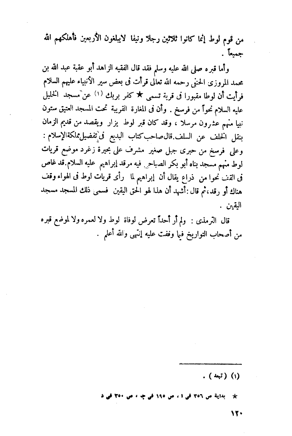 وأما قبره -صلى اللَّه عليه وسلم- فقد قال الفقيه الزاهد أبو عقبة عبد اللَّه بن محمد المروزي الحنفي رحمه اللَّه تعالى قرأت في بعض سير الأنبياء عليهم السلام فرأيت أن لوطً مقبورًا في قرية تسمى كفر "تبعد" عن مسجد الخليل عليه السلام نحوًا من فرسخ، وأن في المغارة القريبة تحت المسجد العتيق ستون نبيًا منهم عشرون مرسلا، وقد كان قبر لوط يُزار ويُقصد من قديم الزمان بنقل الخلف عن السلف قال صاحب كتاب البديع في تفضيل مملكة الإِسلام: وعلى فرسخ من (حبرى) جبل صغير مشرف على بحيرة زغرد موضع قريات لوط منهم مسجد بناه أبو بكر الصباحى فيه مرقد إبراهيم عليه السلام، قد غاص في القف نحوا من ذراع يقال إن إبراهيم لما رأى قريات لوط في الهواء وقف هناك أو رقد ثم قال: أشهد أن هذا لهو الحق اليقين فسمي ذلك المسجد مسجد اليقين.
