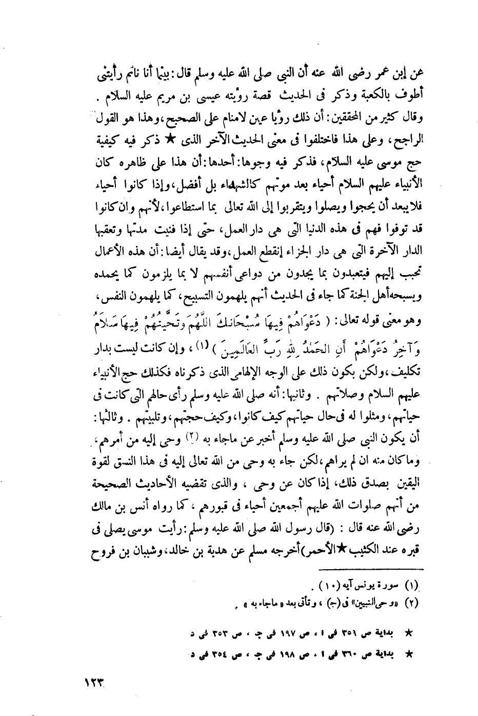 وقال كثير من المحققين: إن ذلك رؤيا عين لا منام على الصحيح، وهذا هو القول الراجح، وعلى هذا فاختلفوا في معنى الحديث الآخر الذي ذكر فيه كيفية حج موسى عليه السلام، فذكر فيه وجوها: أحدها: أن هذا على ظاهره كان الأنبياء عليهم السلام أحياء بعد موتهم كالشهداء بل أفضل، وإذا كانوا أحياء فلا يبعد أن يحجوا ويصلوا ويتقربوا إلى اللَّه تعالى بما استطاعوا؛ لأنهم وإن كانوا قد توفوا فهم في هذه الدنيا التي هي دار العمل، حتى إذا فنيت مدتها وتعقبها الدار الآخرة التي هي دار الجزاء