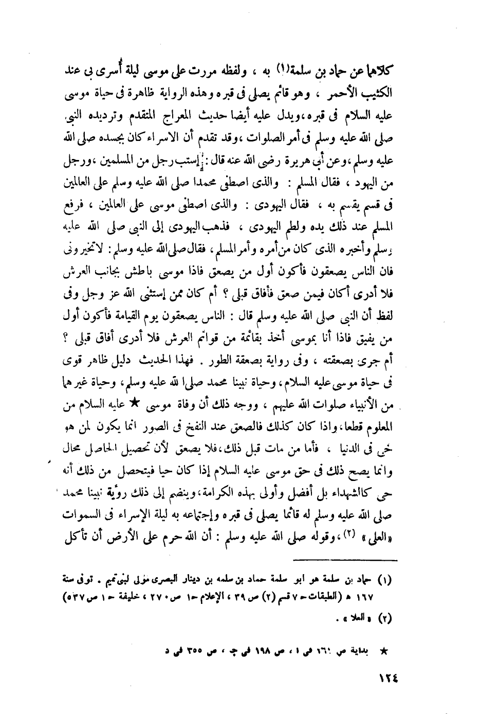 كلاهما عن حماد بن سلمة به ولفظه مررت على موسى ليلة أسري بي عند الكثيب الأحمر، وهو قائم يصلي في قبره، وهذه الرواية ظاهرة في حياة موسى عليه السلام في قبره، ويدل عليه أيضا حديث المعراج المتقدم وترديده النبي -صلى اللَّه عليه وسلم- في أمر الصلوات، وقد تقدم أن الإسراء كان بجسده -صلى اللَّه عليه وسلم-، وعن أبي هريرة -رضي اللَّه عنه- قال: استب رجل من المسلمين، ورجل من اليهود، فقال المسلم: والذي اصطفى محمدا -صلى اللَّه عليه وسلم- على العالمين في قسم يقسم به، فقال اليهودي والذي اصطفى موسى على العالمين، فرفع المسلم عند ذلك يده ولطم اليهودي، فذهب اليهودي إلى النبي -صلى اللَّه عليه وسلم- وأخبره الذي كان من أمره وأمر المسلم، فقال -صلى اللَّه عليه وسلم-: "لا تخيروني فإن الناس يصعقون