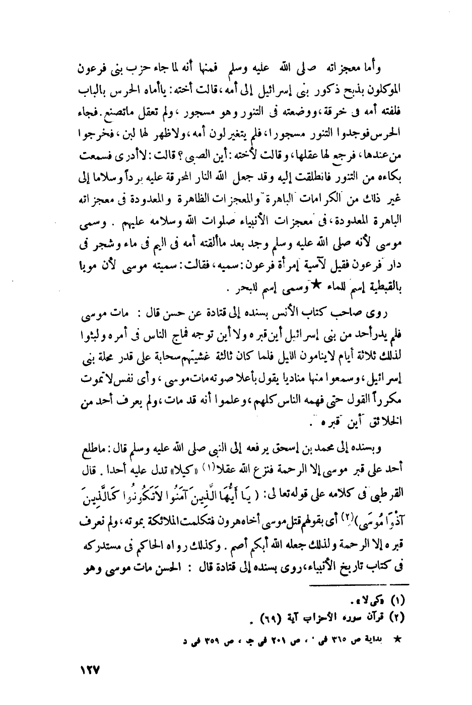وبسنده إلى محمد بن إسحاق يرفعه إلى النبي -صلى اللَّه عليه وسلم- قال: ما طلع أحد على قبر موسى إلا الرحمة فنزع اللَّه عقلا كي لا تدل عليه أحدا، قال القرطبي في كلامه على قوله تعالى: {يَاأَيُّهَا الَّذِينَ آمَنُوا لَا تَكُونُوا كَالَّذِينَ آذَوْا مُوسَى} [الأحزاب: 69] , أي بقولهم قتل موسى أخاه هارون فتكلمت الملائكة بموته، ولم نعرف قبره إلا الرحمة ولذلك جعله اللَّه أبكم أصم، وكذلك رواه الحاكم في مستدركه في كتاب تاريخ الأنبياء، روى بسنده إلى قتادة قال الحسن: مات موسى وهو