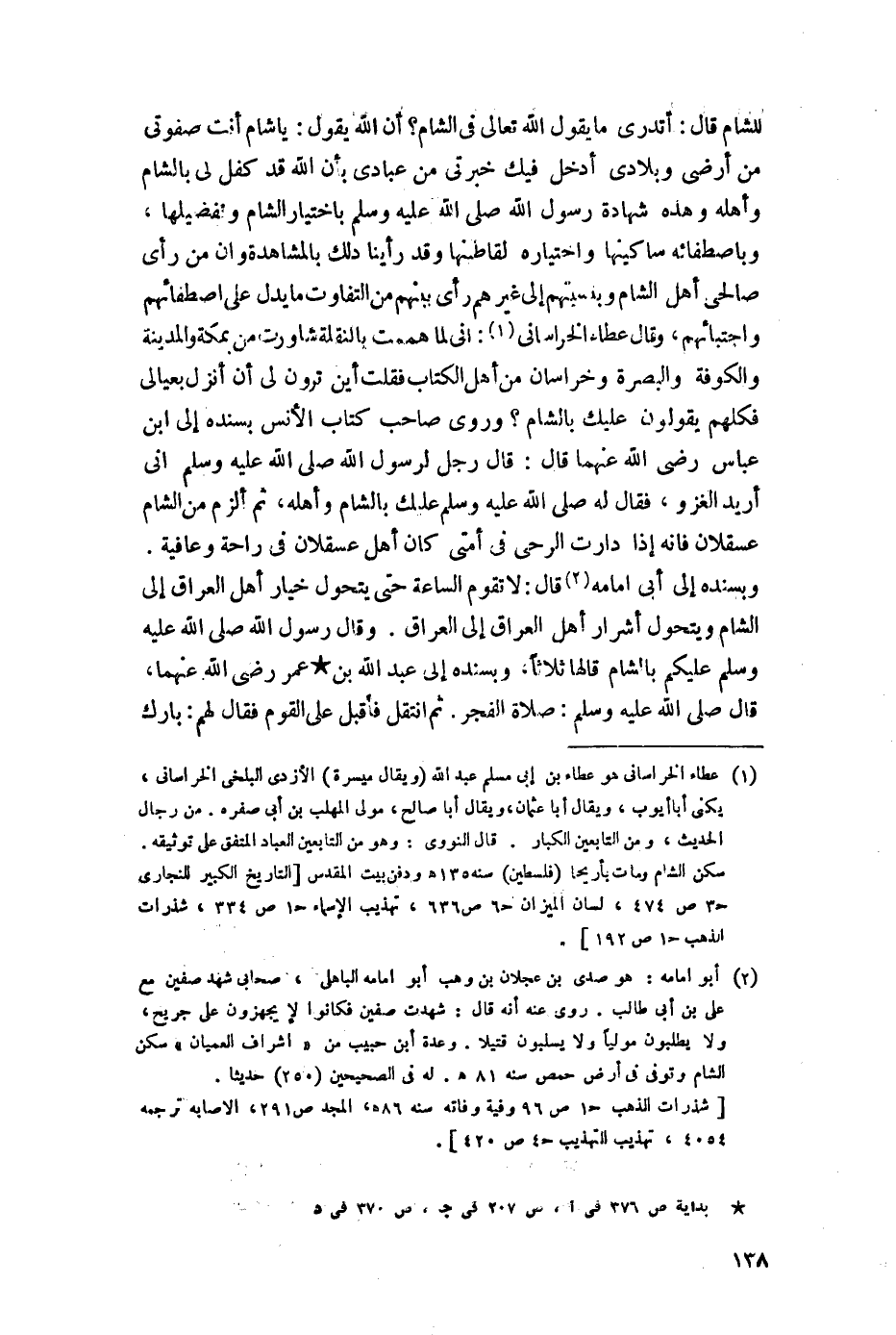 وبسنده إلى أبي أمامة قال: لا تقوم الساعة حتى يتحول خيار أهل العراق إلى الشام ويتحول أشرار أهل العراق إلى العراق، وقال رسول اللَّه -صلى اللَّه عليه وسلم-: "عليكم بالشام" قالها ثلاثًا، وبسنده إلى عبد اللَّه بن عمر رضي اللَّه عنهما قال -صلى اللَّه عليه وسلم-: "صلاة الفجر"، ثم انتقل فأقبل على القوم فقال لهم: "بارك