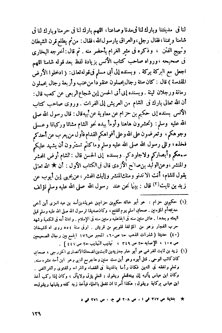 لنا في مدينتا وبارك لنا في مدنا وصاعنا، اللهم بارك لنا في حرمنا وبارك لنا في شامنا ويمننا"، فقال رجل، والعراق يا رسول اللَّه، فقال: "من ثم يطلع قرن الشيطان وتهيج الفتن"، وذكره في مثير الغرام بأخصر منه، ثم قال: أخرجه البخاري في صحيحه, ورواه صاحب كتاب الإنس بزيادة لفظ بعد قوله شامنا اللهم اجعل مع البركة بركة، وبسنده إلى أبي مسلم في قوله تعالى: {ادْخُلُوا الْأَرْضَ الْمُقَدَّسَةَ} [المائدة: 21]، قال: كان ستة رجال يحملون عنقودًا من عنب وأربعة رجال يحملون رمانة ورجلان تينة، وبسنده إلى أبي الحسن ابن شجاع الربعى عن كعب قال: إن اللَّه تعالى بارك في الشام من العريش إلى الفرات، وروى صاحب كتاب الأنس بسنده إلى حكيم بن حزام عن معاوية عن أبيه قال: قال رسول اللَّه -صلى اللَّه عليه وسلم-: "تحشرون ههنا وأومأ بيده نحو الشام مشاة وركبانا وعلى وجوهكم، وتعرضون على اللَّه وعلى أفواهكم القدام فأول من يعرب عن أحدكم فخُذه، وتلى رسول اللَّه -صلى اللَّه عليه وسلم- {وَمَا كُنْتُمْ تَسْتَتِرُونَ أَنْ يَشْهَدَ عَلَيْكُمْ سَمْعُكُمْ وَلَا أَبْصَارُكُمْ وَلَا
