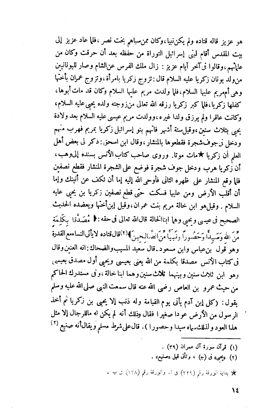 زكريا عليه السلام: قال تزوج زكريا عليه السلام بامرأة، وتزوج عمران بأختها وهي أم مريم عليها السلام، فلما ولدت مريم عليه السلام وكان قد مات أبوها، كفلها زكريا، فلما كبر زكريا رزقه اللَّه تعالى من زوجته ولده يحيى عليه السلام وكانت عاقرًا ولم يرزق ولدًا غيره وولدت مريم عيسى عليه السلام بعد ولادة يحيى بثلاث سنين، وقيل ستة أشهر فاتهم بنو إسرائيل زكريا بمريم فهرب منهم ودخل في جوف شجرة فقطعوها بالمنشار.
