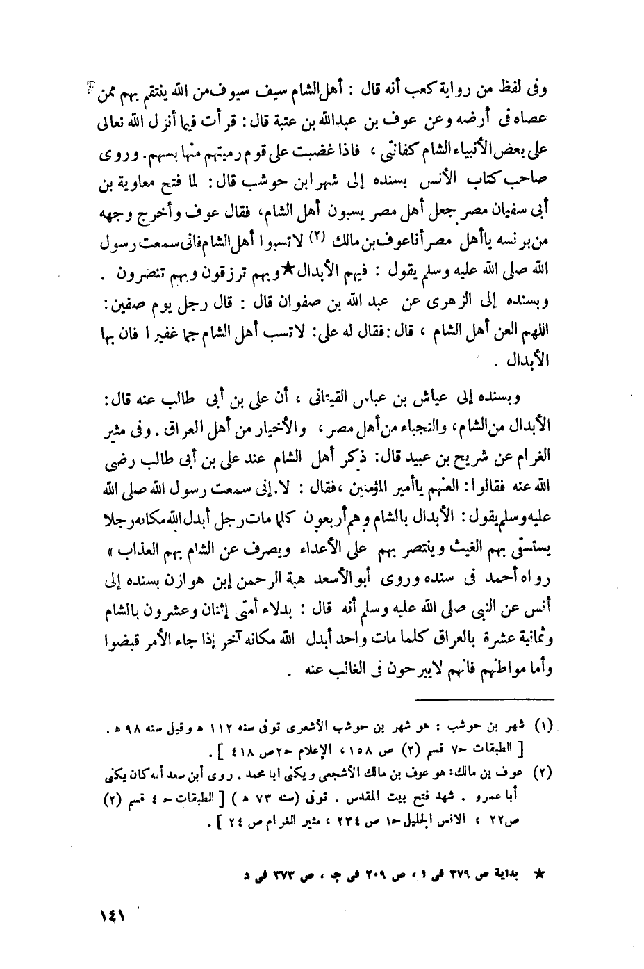 وفي مثير الغرام عن شريح بن عبيد قال: ذكر أهل الشام عند علي بن أبي طالب -رضي اللَّه عنه- فقالوا: العنهم يا أمير المؤمنين، فقال: لا إني سمعت رسول اللَّه -صلى اللَّه عليه وسلم- يقول: "الأبدال بالشام وهم أربعون كما مات رجل أبدل اللَّه مكانه رجلًا يستسقي بهم الغيث وينتصر بهم على الأعداء ويصرف عن الشام بهم العذاب" رواه أحمد في مسنده
