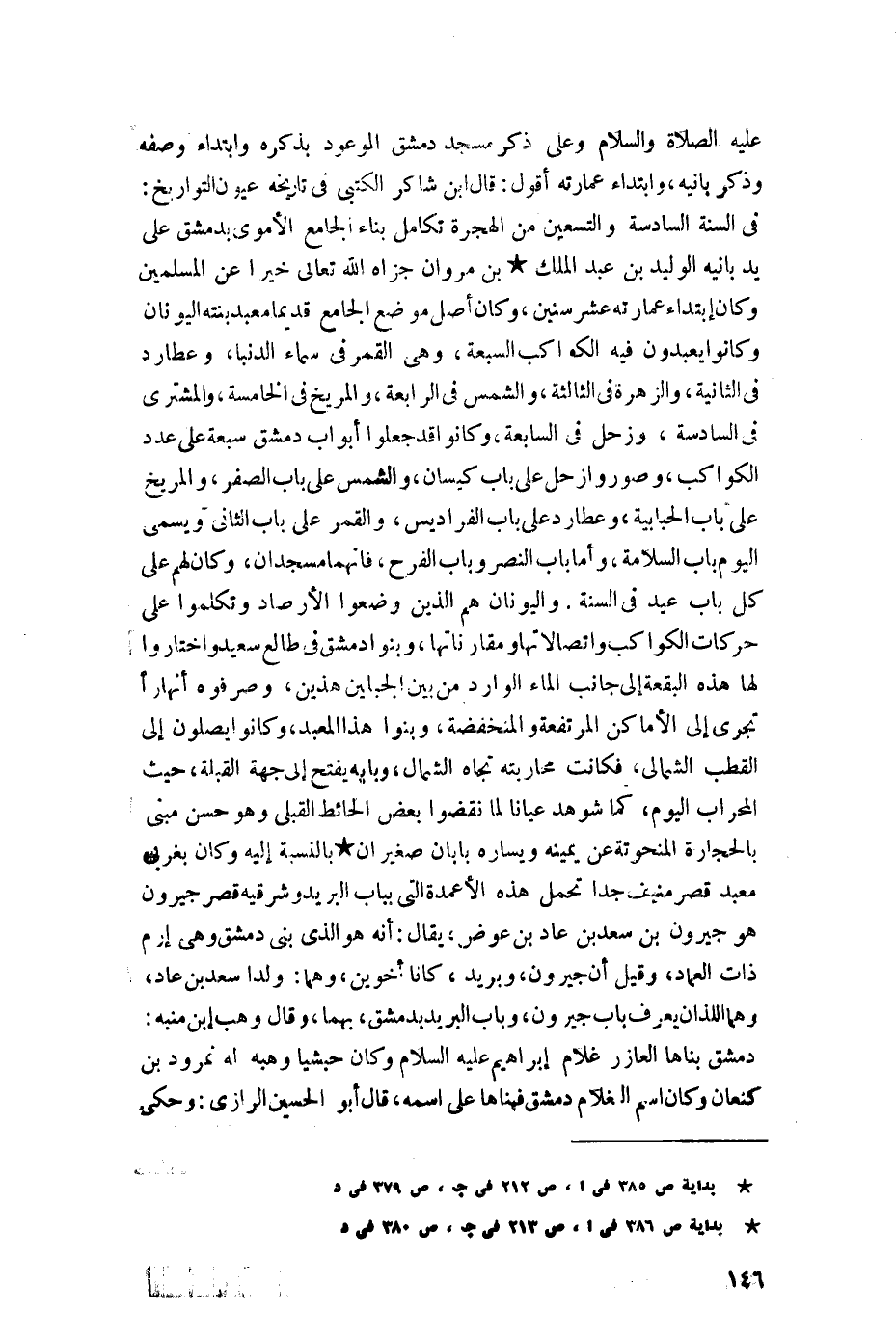 عليه السلام وعلى ذكر مسجد دمشق الموعود بذكره وابتداء وصفه وذكر بانيه، وابتداء عمارته أقول: قال ابن شاكر الكتبي في تاريخه عيون التواريخ في السنة السادسة والتسعين من الهجرة تكامل بناء الجامع