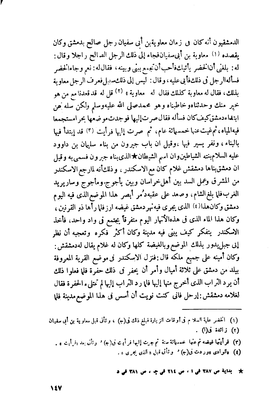 فعرف الرجل معاوية بذلك، فقال له معاوية قل له قد قعدنا مع من هو خير منك وحدثناه وخاطبناه وهو محمد -صلى اللَّه عليه وسلم- ولكن سله عن ابتداء دمشق كيف كان فسأله فقال صرت إليها فوجدت موضعها بحرا مستجمعا فيه المياه، ثم غبت عنها خمسمائة عام، ثم صرت إليها فرأيت قد ابتدأ فيها بالبناء، ونفر يسير فيها، وقيل إن باب جيرون من بناء سليمان بن داود عليه السلام بنته الشياطين وإن اسم الشيطان الذي بناه جيرون فسمى به وقيل إن دمشق بناها دمشقش غلام كان مع الإسكندر، وذلك أنه لما رجع الإسكندر من المشرق وعمل السد بين أهل خراسان وبين يأجوج ومأجوج وسار يريد الغرب فلما بلغ الشام، وصعد على عقبه دمر أبصر هذا الموضع الذي فيه اليوم دمشق وكان هذا الوادي الذي يجري فيه شهر دمشق غيضه أرز فلما رآها ذو القرنين، وكان هذا الماء الذي في هذه الأنهار اليوم متفرقًا يجتمع في واد واحد، فأخذ الإسكندر يتفكر كيف يبنى فيه مدينة وكان أكثر فكره وتعجبه أن نظر إلى جبل يدور بذلك الموضع وبالغيضة كلها وكان له غلام يقال له دمشقش: وكان أمينه على جميع ملكه قال: فنزل الإسكندر في موضع القرية المعروفة ببلد من دمشق على ثلاثة أميال وأمر أن يحفر في ذلك حفرة فلما فعلوا ذلك أن يرد التراب الذي أخرج منها إليها فلما رد التراب إليها لم تمتلئ الحفرة فقال لغلامه دمشقش: ارحل فإني كنت نويت أن أسس في هذا الموضع مدينة فلما