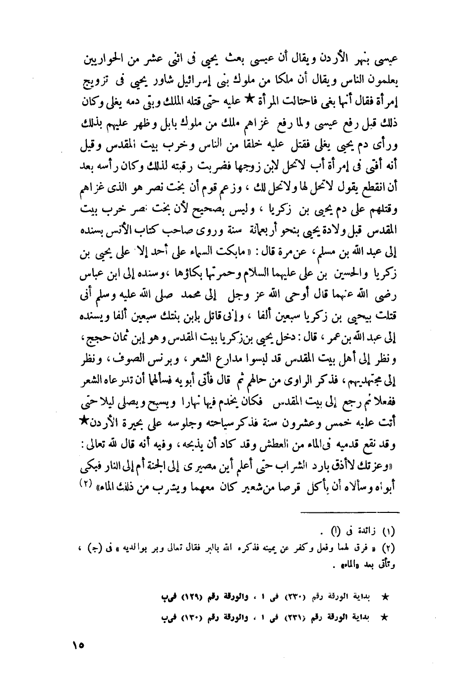 قتلت بيحيى بن زكريا سبعين ألفًا، وإنِّي قاتل بابن بنتك سبعين ألفًا وبسنده إلى عبد اللَّه بن عمر، قال: دخل يحيى بن زكريا بيت المقدس وهو ابن ثماني حجج، ونظر إلى أهل بيت المقدس قد لبسوا مدارع الشعر، وبرنس الصوف، ونظر إلى مجتهديهم، فذكر الراوي من حالهم ثم قال فأتى أبويه فسألهما أن تدرعاه الشعر ففعلا ثم رجع إلى بيت المقدس فكان يخدم فيها نهارًا ويسبح ويصلي ليلًا حتى أتت عليه خمس وعشرون سنة فذكر سياحته وجلوسه على بحيرة الأردن وقد نقع قدميه في الماء من العطش وقد كاد أن يذبحه، وفيه أنه قال للَّه تعالى: "وعزتك لا أذوق (*) بارد الشراب حتى أعلم أين مصيري إلى الجنة أم إلى النار فبكى أبواه وسألاه أن يأكل قرصًا من شعير كان معهما ويشرب من ذلك الماء"