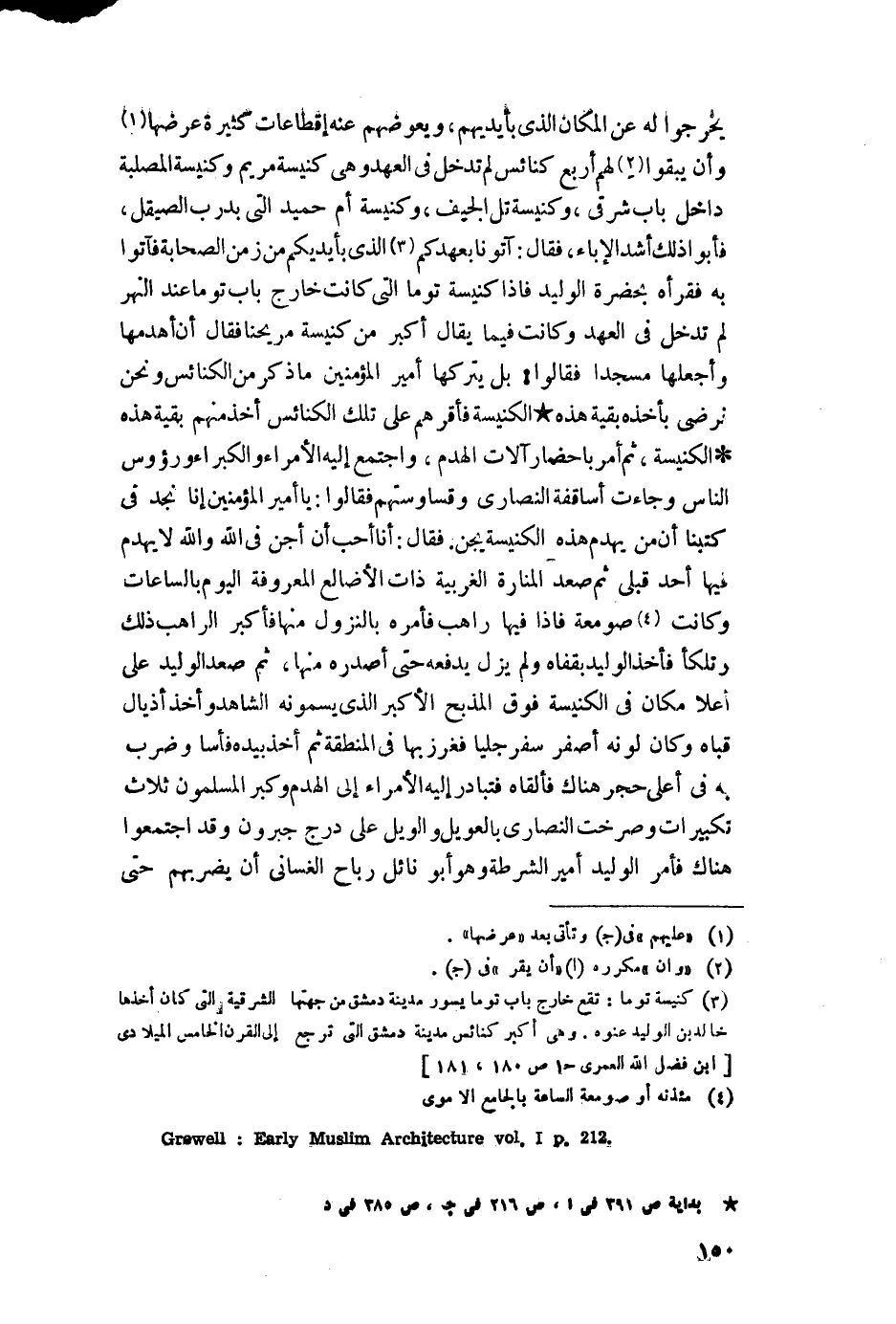 يخرجوا له عن المكان الذي بأيديهم، ويعوضهم عنه إقطاعات كثيرة عرضها عليهم وأن يبقوا لهم أربع كنائس لم تدخل في العهد وهي كنيسة مريم وكنيسة المصلبة داخل باب شرقي، وكنيسة تل الجيف، وكنيسة أم حميد التي بدرب الصقيل، فأبوا ذلك أشد الإباء فقال: آتونا بعهدكم الذي بأيديكم من زمن الصحابة فأتوا به فقرأه بحضرة الوليد، فإذا كنيسة توما التي كانت خارج باب توما عند النهر لم تدخل في العهد، وكانت فيما يقال أكبر من كنيسة مري حنا فقال أن اهدمها واجعلها مسجدا فقالوا: بل يتركها أمير المؤمنين ما ذكر من الكنائس ونحن نرضى بأخذه بقية هذه الكنيسة فأقرهم على تلك الكنائس وأخذ منهم بقية هذه الكنيسة، ثم أمر بإحضار آلات الهدم، واجتمع إليه الأمراء والكبراء رؤوس الناس، وجاءت أساقفة النصارى وقساوستهم، فقالوا: يا أمير المؤمنين إنا نجد في كتبنا أن من يهدم هذه الكنيسة يجن، فقال: أنا أحب أن أجن في اللَّه واللَّه لا يهدم فيها أحد قبلي، ثم صعد المنارة الغربية ذات الأضالع المعروفة اليوم بالساعات وكانت صومعة، فإذا فيها راهب فأمره بالنزول منها فأكبر الراهب ذلك وتلكأ فأخذ الوليد بقفاه، ولم يزل يدفعه حتى أصدره منها، ثم صعد الوليد على أعلى مكان في الكنيسة فوق المذبح الأكبر الذي يسمونه الشاهد وأخذ أذيال قباه، وكان لونه أصفر سفرجليا فغرز بها في المنطقة، ثم أخذ بيده فأسا وضرب به في أعلى حجر هناك فألقاه فتبادر إليه الأمراء إلى الهدم وكبَّر المسلمون ثلاث تكبيرات وصرخت النصارى بالعويل والويل على درج جبرون وقد اجتمعوا هناك فأمر الوليد أمير الشرطة وهو أبو نائل رباح الغساني أن يضربهم حتى