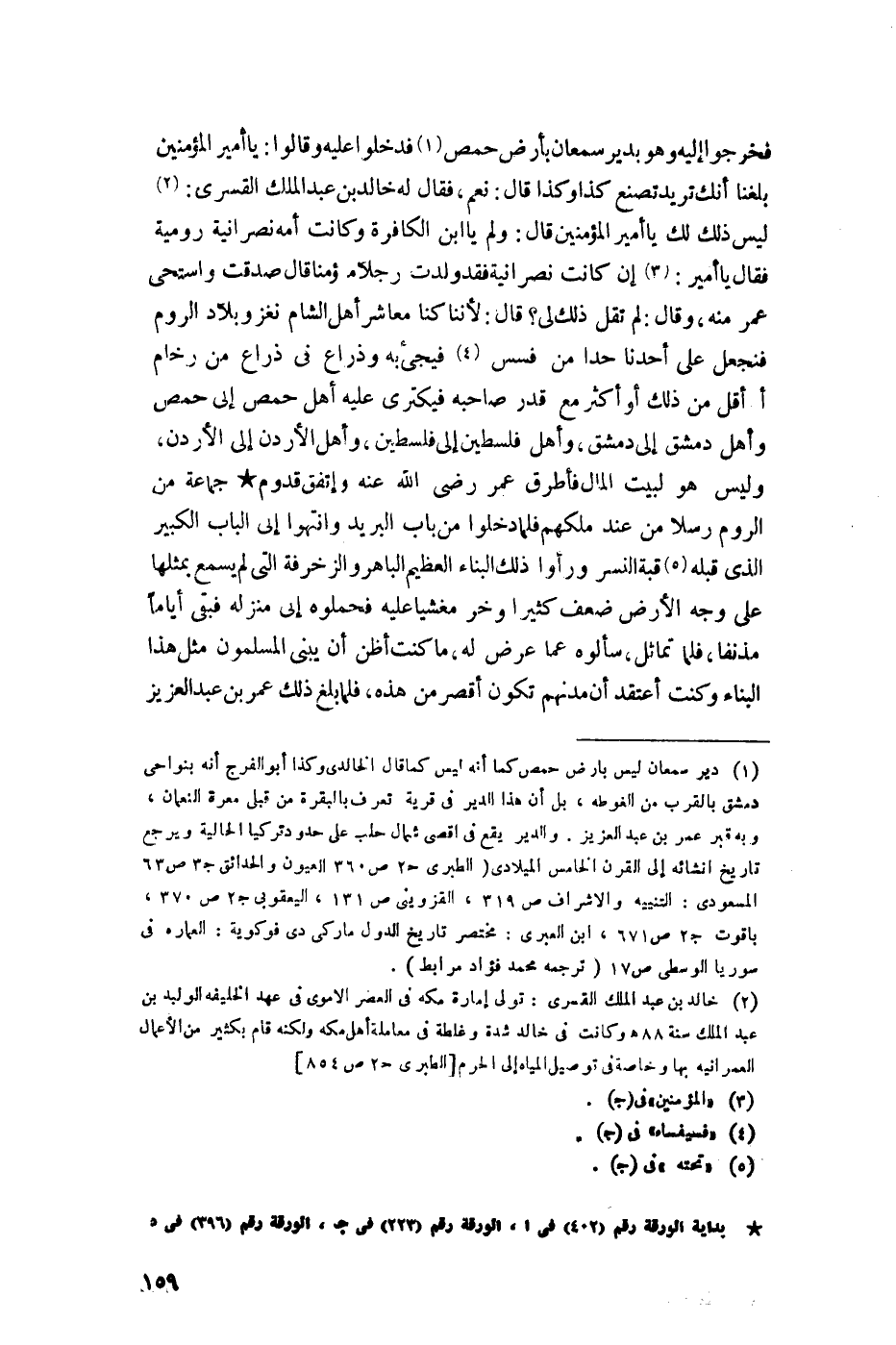 فخرجوا إليه وهو بدير سمعان بأرض حمص فدخلوا عليه وقالوا: يا أمير المؤمنين بلغنا أنك تريد أن تصنع كذا وكذا قال: نعم، فقال له خالد بن عبد الملك القسري: ليس ذلك لك يا أمير المؤمنين قال: ولم لا يا ابن الكافرة وكانت أمه نصرانية رومية، فقال يا أمير: إن كانت نصرانية فقد ولدت رجلا مؤمنا قال صدقت واستحى عمر منه، وقال: لم تقل ذلك لي؟ قال: لأننا كنا معاشر أهل الشام نغزو بلاد الروم فنجعل على أحدنا حدا من فسس فيجيء به وذراع في ذراع من رخام أو أقل من ذلك أو أكثر مع قدر صاحبه فيكتري عليه أهل حمص إلى حمص وأهل دمشق إلى دمشق، وأهل فلسطين إلى فلسطين، وأهل الأردن إلى الأردن، وليس هو لبيت المال فأطرق عمر -رضي اللَّه عنه-، واتفق قدوم جماعة من الروم رسلا من عند ملكهم فلما دخلوا من باب البريد وانتهوا إلى الباب الكبير الذي قبله قبة النسر ورأوا ذلك البناء العظيم الباهر، والزخرفة التي لم يسمع بمثلها على وجه الأرض ضعف كثيرًا وخر مغشيا عليه،