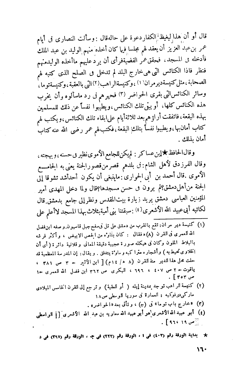 وسألت النصارى في أيام عمر بن عبد العزيز أن يعقد لهم مجلسًا فيما كان أخذه منهم الوليد بن عبد الملك فأدخله في المسجد، فحقق عمر القضية فرأى أن يرد عليهم ما أخذه الوليد منهم، فنظر فإذا الكنائس التي هي خارج البلد لم تدخل في الصلح الذي كتبه لهم الصحابة، مثل كنيسة دير مران وكنيسة الراهب التي بالعقبة، وكنيسة توما، وسائر الكنائس التي بقرى الحواضر فخيرهم في رد ما سألوه وأن يخرب هذه الكنائس كلها، أو يبقي تلك الكنائس، ويطيبوا نفسًا عن ذلك للمسلمين بهذه البقعة، فاتفقت آراؤهم بعد ثلاثة أيام على إبقاء تلك الكنائس ويكتب لهم كتاب أمان بها، ويطبوا نفسا بتلك البقعة، فكتب لهم عمر -رضي اللَّه عنه- كتاب أمان بذلك.