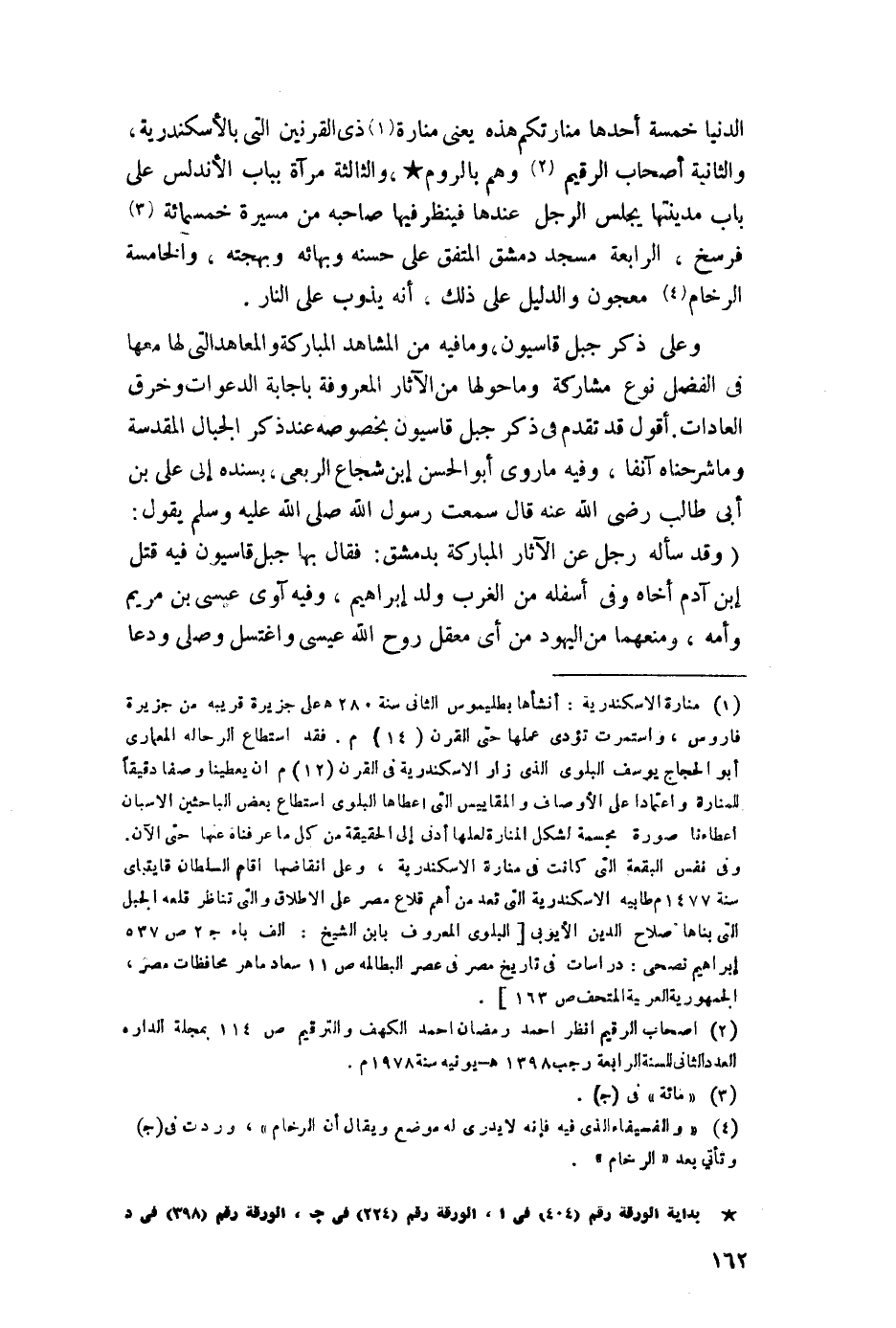 الدنيا خمسة أحدها منارتكم هذه -يعنى منارة ذي القرنين التي بالإسكندرية-، والثانية: أصحاب الرقيم -وهم بالروم- والثالثة: مرآة بباب الأندلس على باب مدينتها يجلس الرجل عندها فينظر فيها صاحبه من مسيرة خمسمائة فرسخ، الرابعة: مسجد دمشق المتفق على حسنه وبهائه وبهجته، والخامسة: الرخام معجون والدليل على ذلك، أنه يذوب على النار.