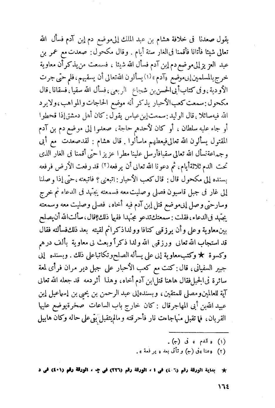 فرفعه بسنده إلى مكحول قال: قال كعب الأحبار: اتبعني فاتبعته، حتى إذا وصلنا إلى غار في جبل قاسيون فصلى وصليت معه فسمعته يجتهد في الدعاء، ثم خرج وسار حتى وصل إلى موضع قتل ابن آدم فيه أخاه، فصلى وصليت معه، وسمعته يجتهد في الدعاء، فقلت: سمعتك تدعو مجتهدا ففيما ذلك؟ قال، سألت اللَّه أن يصلح بين معاوية وعلي وأن يرزقني كنافا وولدا ذكرًا ثم لقيته بعد ذلك فسألته فقال قد استجاب اللَّه تعالى ورزقني اللَّه ولدا ذكرًا وبعث لي معاوية بألف درهم وكسوة، وكتب معاوية إلى علي يسأله الصلح وتكاتبا على ذلك، وبسنده.