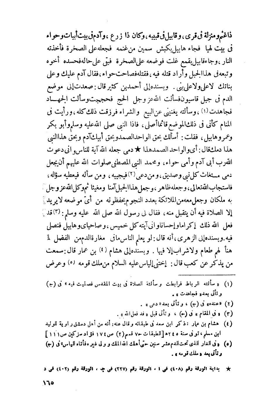 ذا غنم ومنزلة في قرى، وقابيل في قبيبه، وكان ذا زرع، وآدم في بيت أبيات، وحواء في بيت لهيا، فجاء هابيل بكبش سمين من غنمه فجعله على الصخرة فأخذته النار، وجاء قابيل بقمع غلت فوضعه على الصخرة فبقي على حاله فحسد أخوه وتبعه في هذا الجبل وأراد قتله فيه فصاحت حواء: فقال آدم: "عليك وعلى بناتك لا عليّ ولا على بني" وبسنده إلى أحمد بن كثير قال: صعدت إلى موضع الدم لي جبل قاسيون فسألت اللَّه عز وجل الحج فحججت، وسألت الجهاد فجاهدت وسألته الرباط فرابطت، وسألته الصلاة في بيت المقدس فصليت فيه، وسألته يغنيني عن البيع والشراء فرزقت ذلك كله، ورأيت في المنام كأني في ذلك الموضع قائمًا أصلي، فإذا النبي -صلى اللَّه عليه وسلم- وأبو بكر وعمر وهابيل، فقلت: أسألك بحق الواحد الصمد وبحق أبيك آدم وبحق هذا النبي هذا دمك؟ قال: أي والواحد الصمد هذا دمي جعله اللَّه آية للناس، وإني دعوت اللَّه رب أبي آدم وأمي حواء، ومحمد النبي المصطفى صلوات اللَّه عليهم أن يجعل دمي مستغاث كل نبي وصدّيق، ومن دعى فيجيبه، ومن سأله فيعطه سؤاله، فاستجاب اللَّه تعالى، وجعله