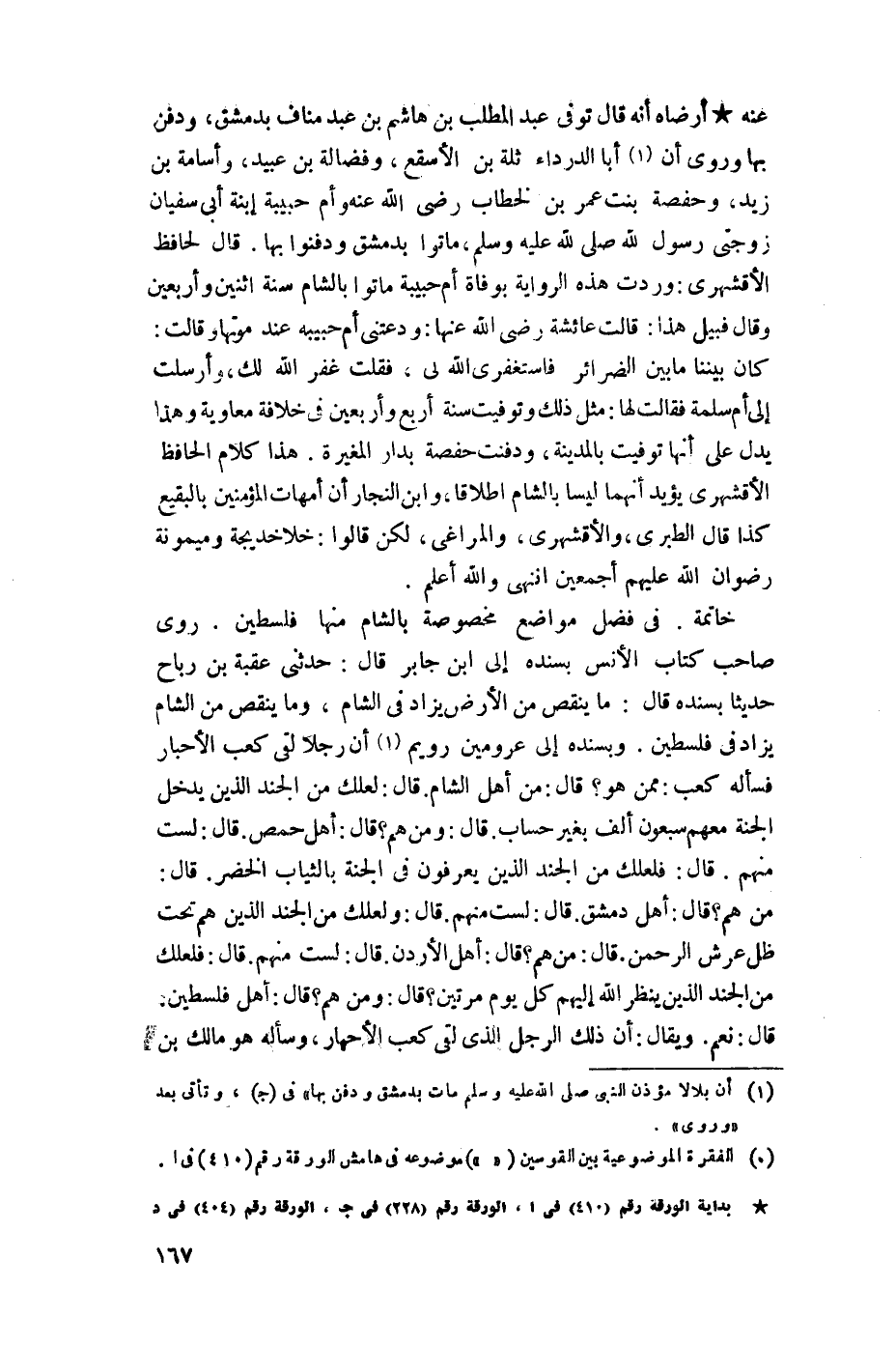 عنه- وأرضاه أنه قال توفي عبد المطلب بن هاشم بن عبد مناف بدمشق، ودفن بها وروي أن بلالًا مؤذن الرسول -صلى اللَّه عليه وسلم- مات بدمشق، ودفن بها أبا الدرداء واثلة بن الأسقع، وفضالة بن عبيد، وأسامة بن زيد، وحفصة بنت عمر بن الخطاب -رضي اللَّه عنه- أم حبيبة ابنة أبي سفيان زوجتى رسول اللَّه -صلى اللَّه عليه وسلم- ماتوا بدمشق ودفنوا بها.