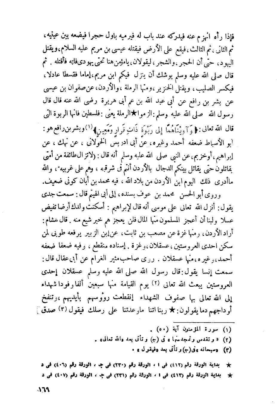 عن صفوان بن عيسى عن بشر بن رافع عن أبي عبد اللَّه بن عم أبي هريرة -رضي اللَّه عنه- قال: قال رسول اللَّه -صلى اللَّه عليه وسلم-: "الزموا الرملة يعني فلسطين فإنها الربوة التي قال اللَّه تعالى: {وَآوَيْنَاهُمَا إِلَى رَبْوَةٍ ذَاتِ قَرَارٍ وَمَعِينٍ} [المؤمنون: 50]، وبشر بن رافع هو: أبو الأسباط ضعفه أحمد وغيره، وعن أبي إدريس الخولاني، عن نهك، عن إبراهيم أو خزيم عن النبي -صلى اللَّه عليه وسلم- أنه قال: "لا تزال طائفة من أمتى يقاتلون حتى يقاتل بينكم الدجال بالأردن أنتم على شرقيه، وهم على غربيه واللَّه ما أدري ذلك اليوم أين الأردن من بلاد اللَّه" فيه محمد بن أبان كوني ضعيف.