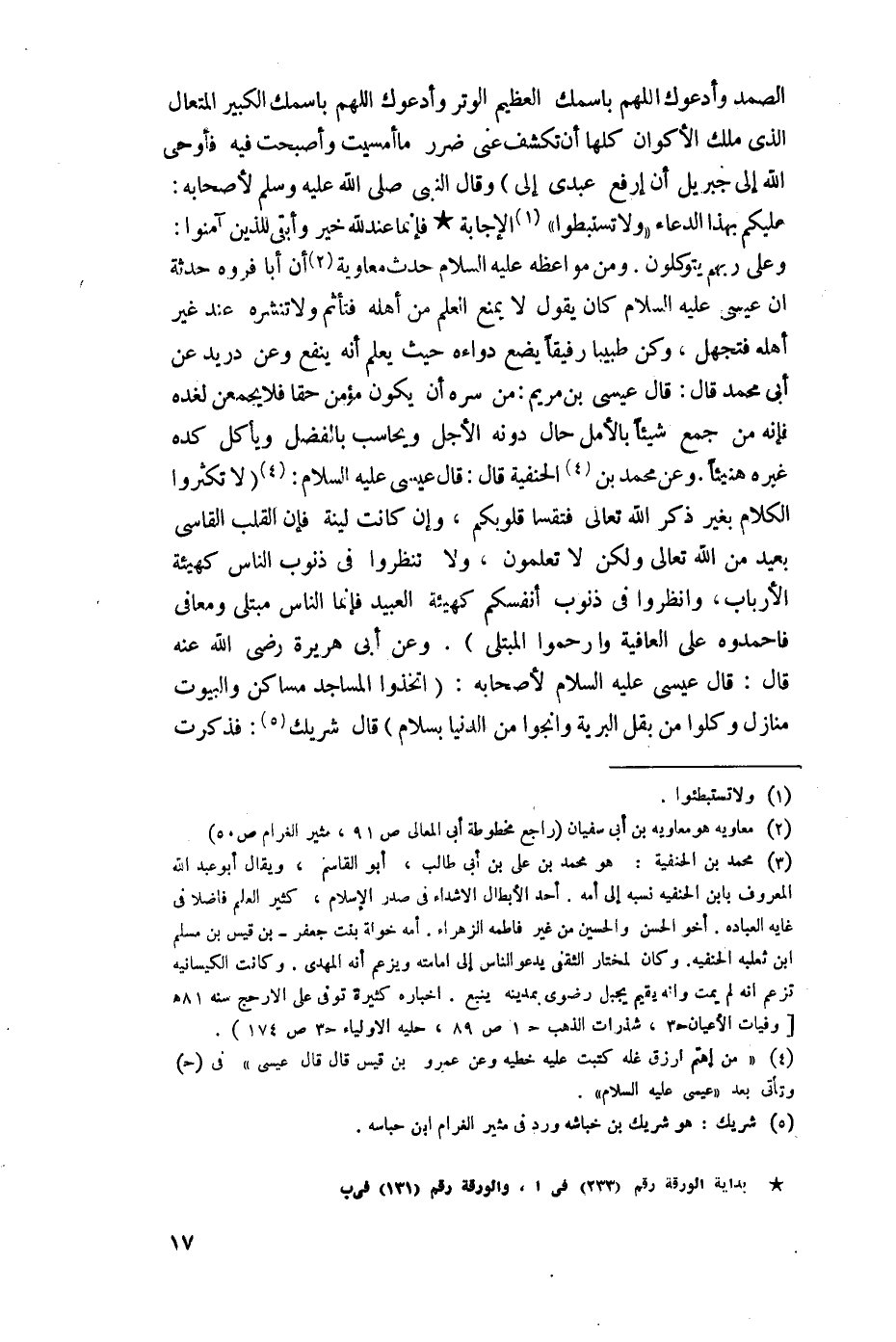 هريرة -رضي اللَّه عنه- قال: قال عيسى -عليه السلام- لأصحابه: (اتخذوا المساجد مساكن والبيوت منازل وكلوا من بقل البرية وانجوا من الدنيا بسلام) قال شريك: فذكرت