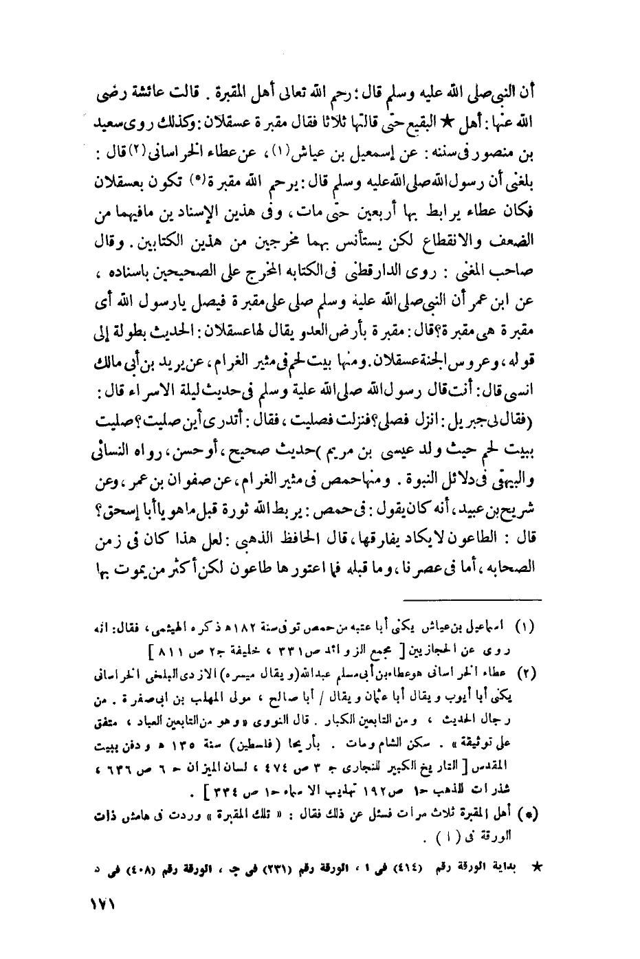 البقيع؟ حتى قالتها ثلاثا فقال: "مقبرة عسقلان" وكذلك روى سعيد بن منصور في سننه: عن إسماعيل بن عياش عن عطاء الخراساني قال: بلغني أن رسول اللَّه -صلى اللَّه عليه وسلم- قال: "يرحم اللَّه مقبرة تكون بعسقلان" فكان عطاء يرابط بها أربعين حتى مات، وفي هذين الإسنادين ما فيهما من الضعف والانقطاع ولكن يستأنس بهما مخرجين من هذين الكتابين.