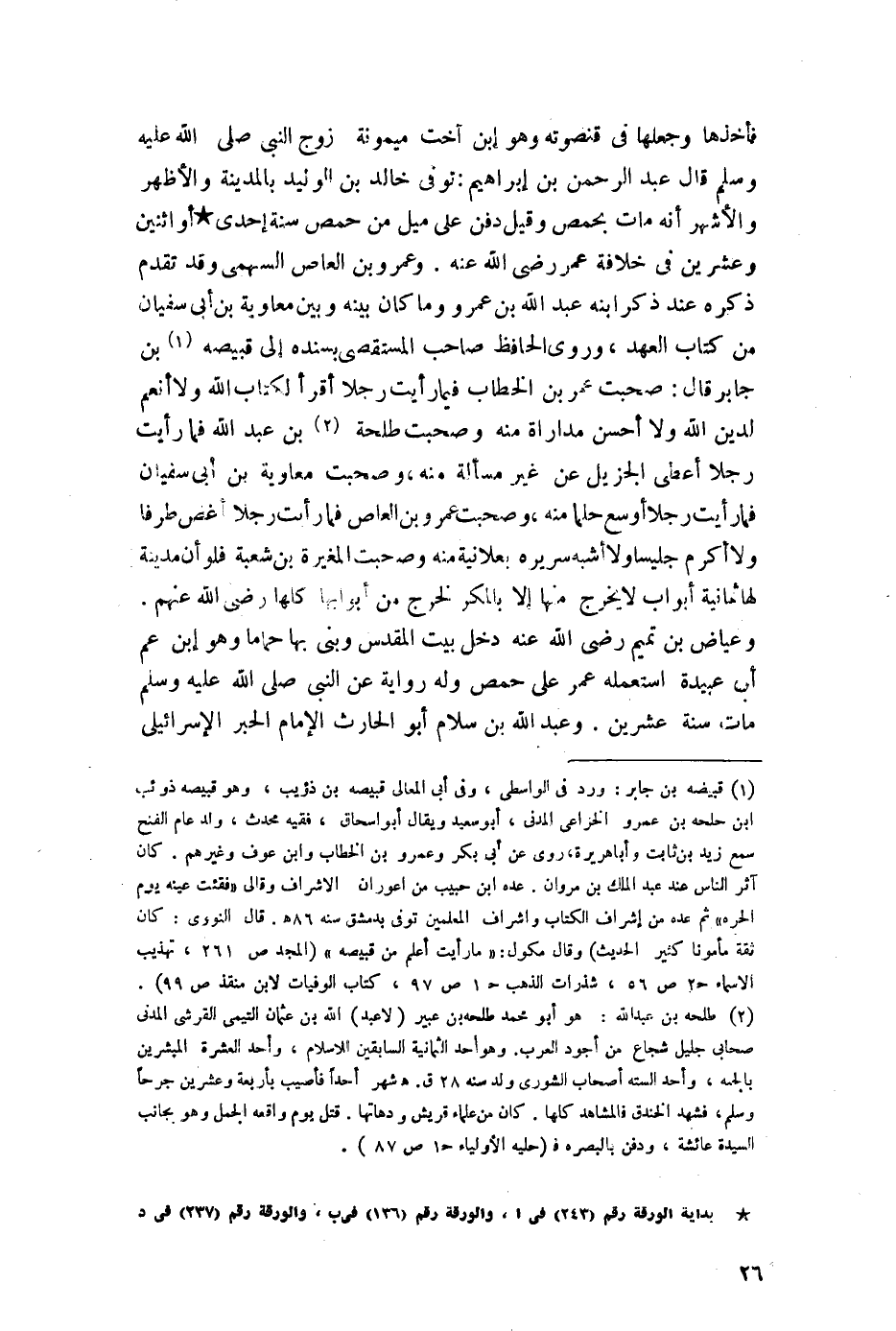 فأخذها وجعلها في قنصوته وهو ابن أخت ميمونة زوج النبي -صلى اللَّه عليه وسلم- قال عبد الرحمن بن إبراهيم: توفي خالد بن الوليد بالمدينة والأظهر والأشهر أنه مات بحمص وقيل دفن على ميل من حمص سنة إحدى أو اثنين