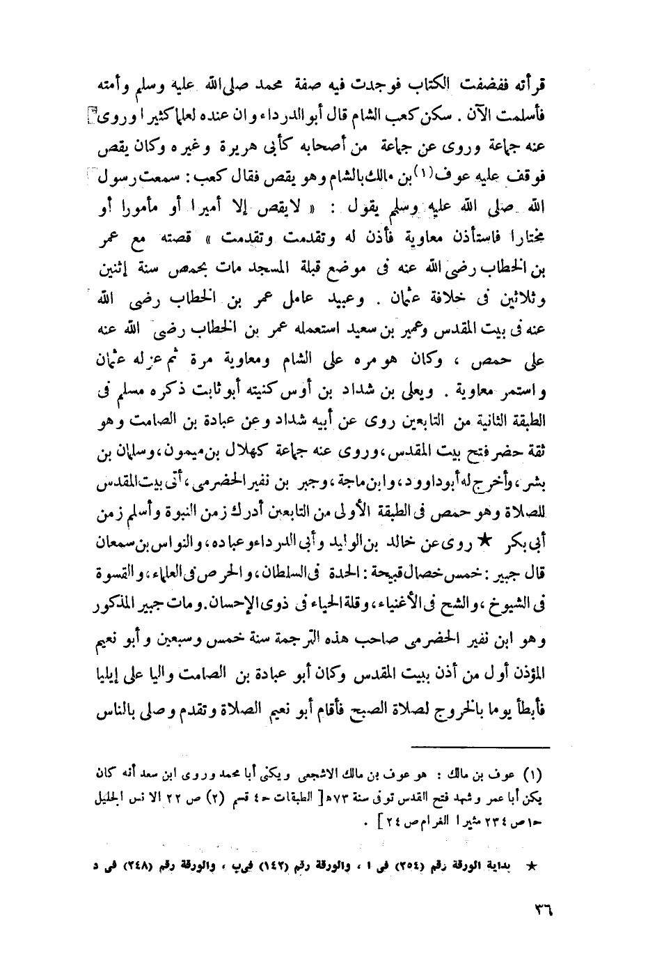 وعبيد عامل عمر بن الخطاب -رضي اللَّه عنه- في بيت المقدس، وعمير بن سعيد واستعمله عمر بن الخطاب -رضي اللَّه عنه- على حمص، وكان هو مرة على الشام ومعاوية مرة ثم عزله عثمان واستمر معاوية، ويعلى بن شداد بن أوس كنيته أبو ثابت ذكره مسلم في الطبقة الثانية من التابعين، روى عن أبيه شداد وعن عبادة بن الصامت وهو ثقة حضر فتح بيت المقدس، وروى عنه جماعة كهلال بن ميمون، وسلمان بن بشر، وأخرج له أبو داود، وابن ماجه، وجبر بن نفير الحضرمي، أتى بيت المقدس للصلاة وهو في الطبقة الأولى من التابعين أدرك زمن النبوة وأسلم زمن أبي بكر روى عن خالد بن الوليد وأبي الدرداء وعبادة، والنواس بن سمعان قال جبير: خمس خصال قبيحة: الحدة في السلطان،