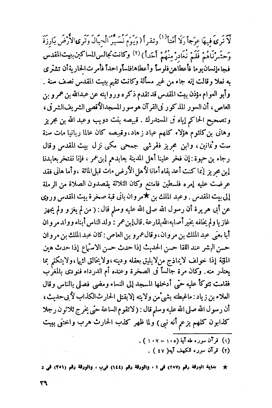 وأبو العوام مؤذن بيت المقدس قد تقدم ذكره وروايته عن عبد اللَّه بن عمرو بن العاص، أن السور المذكور في القرآن هو سور المسجد الأقصى الشريف الشرقي، وتصحيح الحاكم إياه في المستدرك، قبيصة بن ذؤيب وعبد اللَّه بن محيريز وهانئ بن كلثوم هؤلاء كلهم عباد زهاد، وقبيصة كان عالمًا ربانيًا مات سنة ست وثمانين، وابن محيريز قرشي جمحي مكي نزل بيت المقدس وقال رجاء بن حيوة: إن فخر علينا أهل المدينة بعابدهم ابن عمر، فإنا نفتخر بعابدنا ابن محيريز إنما كنت أعد بقاءه أمانا لأهل الأرض، مات قبل المائة، وأما هانئ فقد عرضت عليه إمرة فلسطين فامتنع وكان الثلاثة يقصدون الصلاة من الرملة إلى بيت المقدس.
