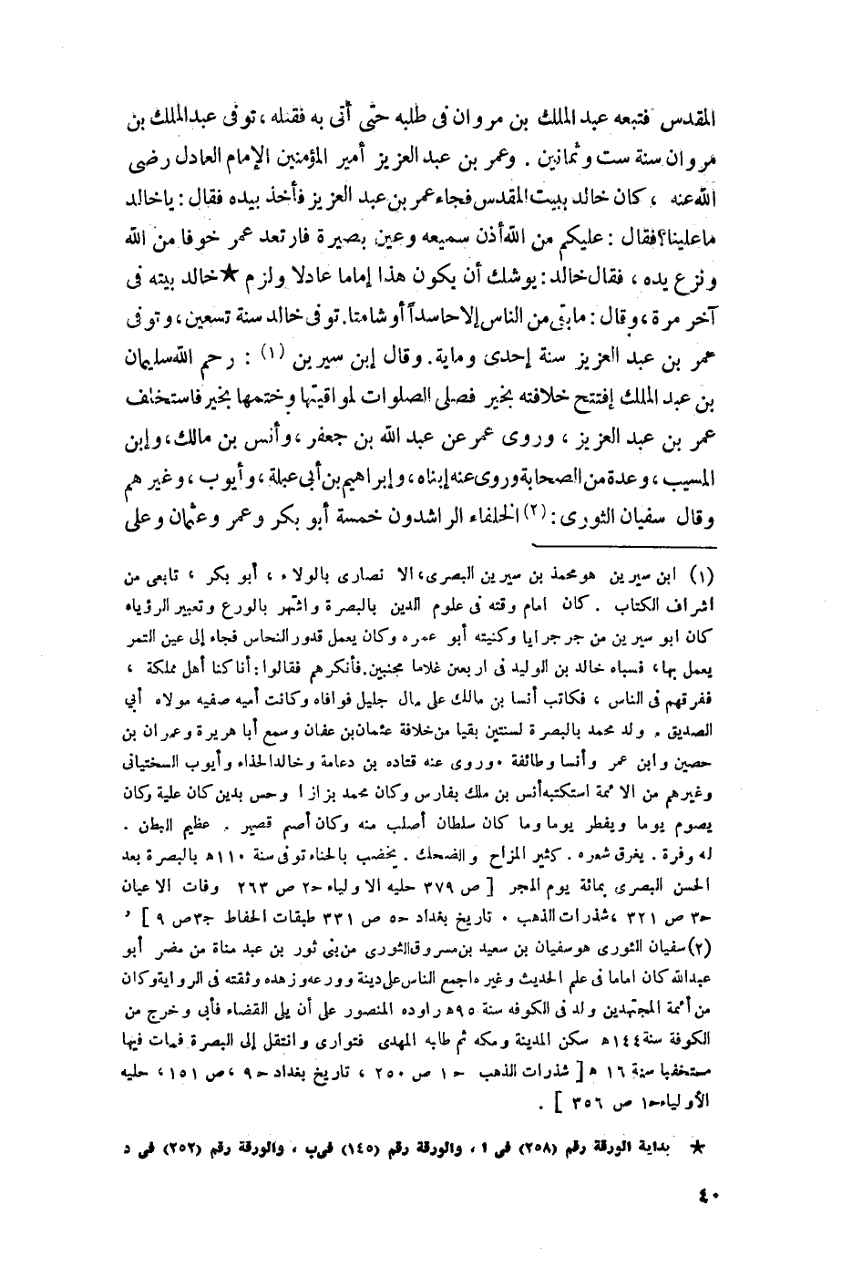 وعمر بن عبد العزيز أمير المؤمنين الإمام العادل -رضي اللَّه عنه-، كان خالد ببيت المقدس فجاء عمر بن عبد العزيز فأخذ بيده فقال: يا خالد ما علينا؟ فقال: عليكم من اللَّه أذن سميعة وعين بصيرة فارتعد عمر خوفًا من اللَّه ونزع يده فقال خالد: يوشك أن يكون هذا إمامًا عادلًا ولزم خالد بيته في آخر مرة، وقال: ما بقى من الناس إلا حاسدًا أو شامتًا توفي خالد سنة تسعين، وتوفي عمر بن عبد العزيز سنة إحدى ومائة، وقال ابن سيرين: رحم اللَّه سليمان بن عبد الملك افتتح خلافته بخير فصلى الصلوات لمواقيتها وختمها بخير فاستخلف عمر بن عبد العزيز، وروى عمر عن عبد اللَّه بن جعفر، وأنس بن مالك، وابن المسيب، وعدة من الصحابة وروى عنه ابناه، وإبراهيم بن أبي عبلة، وأيوب، وغيرهم وقال سفيان الثوري: الخلفاء الراشدون خمسة أبو بكر وعمر وعثمان وعلى