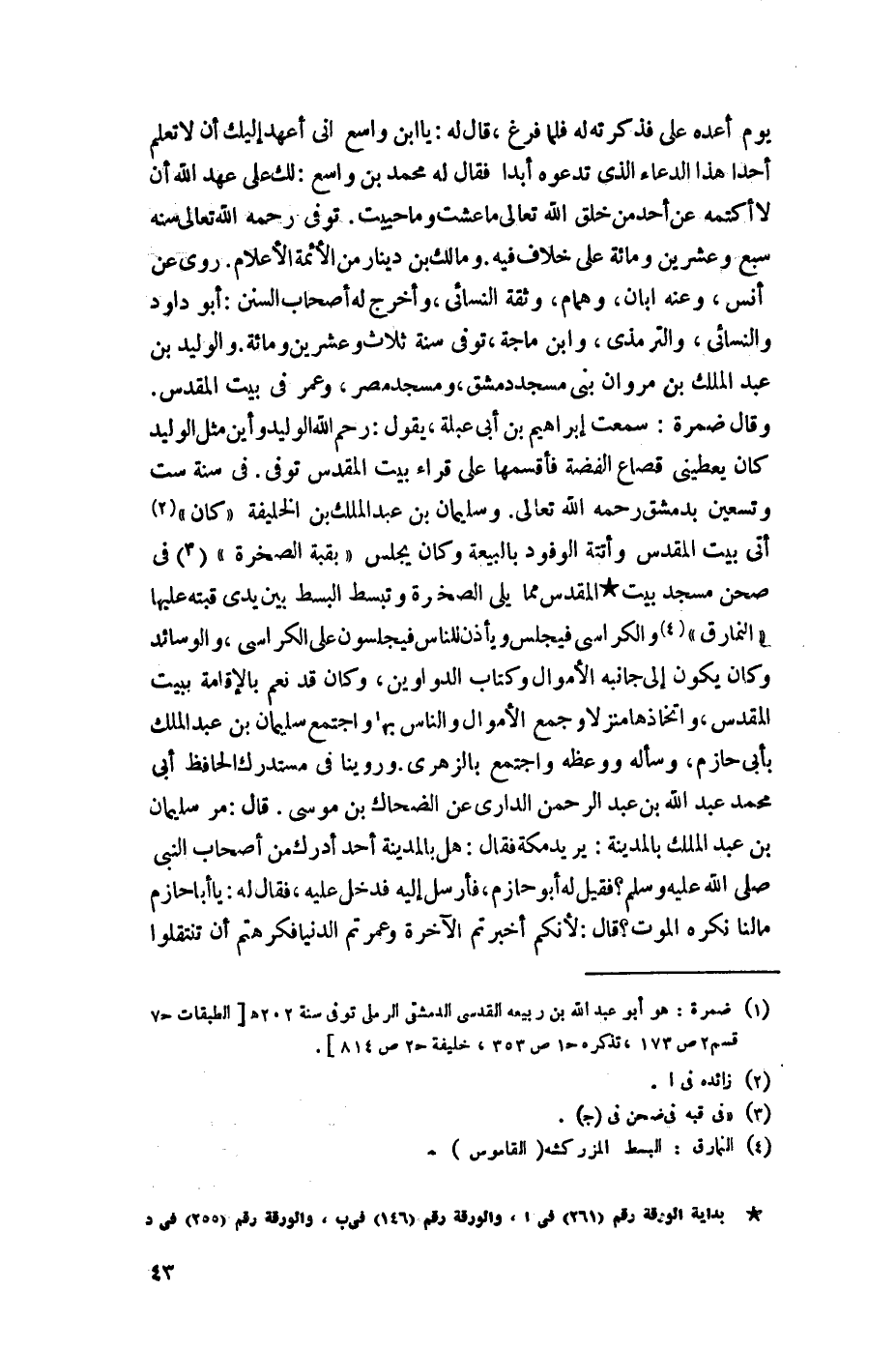وسليمان بن عبد الملك بن الخيلفة "كان" أتى بيت المقدس وأتته الوفود بالبيعة وكان يجلس بـ "قبة الصخرة" في صحن مسجد بيت المقدس مما يلي الصخرة وتبسط البسط بين يدي قبته عليها "النمارق" والكراسي فيجلس ويأذن للناس فيجلسون على الكراسي، والوسائد وكان يكون إلى جانبه الأموال وكتاب الدواوين، وكان قد نعم بالإقامة ببيت المقدس، واتخذها منزلًا وجمع الأموال والناس بها واجتمع سليمان بن عبد الملك بأبي حازم، وسأله ووعظه واجتمع بالزهري، وروينا في مستدرك الحافظ أبي محمد عبد اللَّه بن عبد الرحمن الداري عن الضحاك بن موسى، قال: مر سليمان بن عبد الملك بالمدينة: يريد مكة فقال: هل بالمدينة أحد أدرك من أصحاب النبي -صلى اللَّه عليه وسلم-؟ فقيل له: أبو حازم، فأرسل إليه فدخل عليه، فقال له: يا أبا حزم ما لنا نكره الموت؟ قال: لأنكم خربتم الآخرة وعمرتم الدنيا فكرهتم أن تنتقلوا