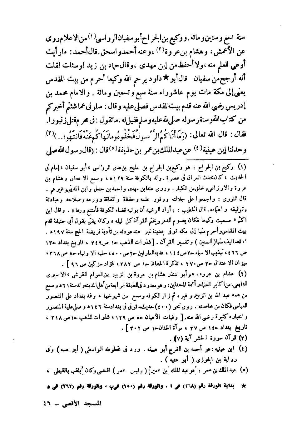 والإمام محمد بن إدريس -رضي اللَّه عنه- قدم بيت المقدس فصلى عليه وقال: سلوني عما شئتم أخبركم من كتاب اللَّه وسنة رسوله -صلى اللَّه عليه وسلم- فقيل له: ما تقول: في محرم قتل زنبورًا فقال: قال اللَّه تعالى: {وَمَا آتَاكُمُ الرَّسُولُ فَخُذُوهُ وَمَا نَهَاكُمْ عَنْهُ فَانْتَهُوا} [الحشر: 7] , وحدثنا ابن عيينة عن عبد الملك بن عمر بن حذيفة قال: قال رسول اللَّه -صلى