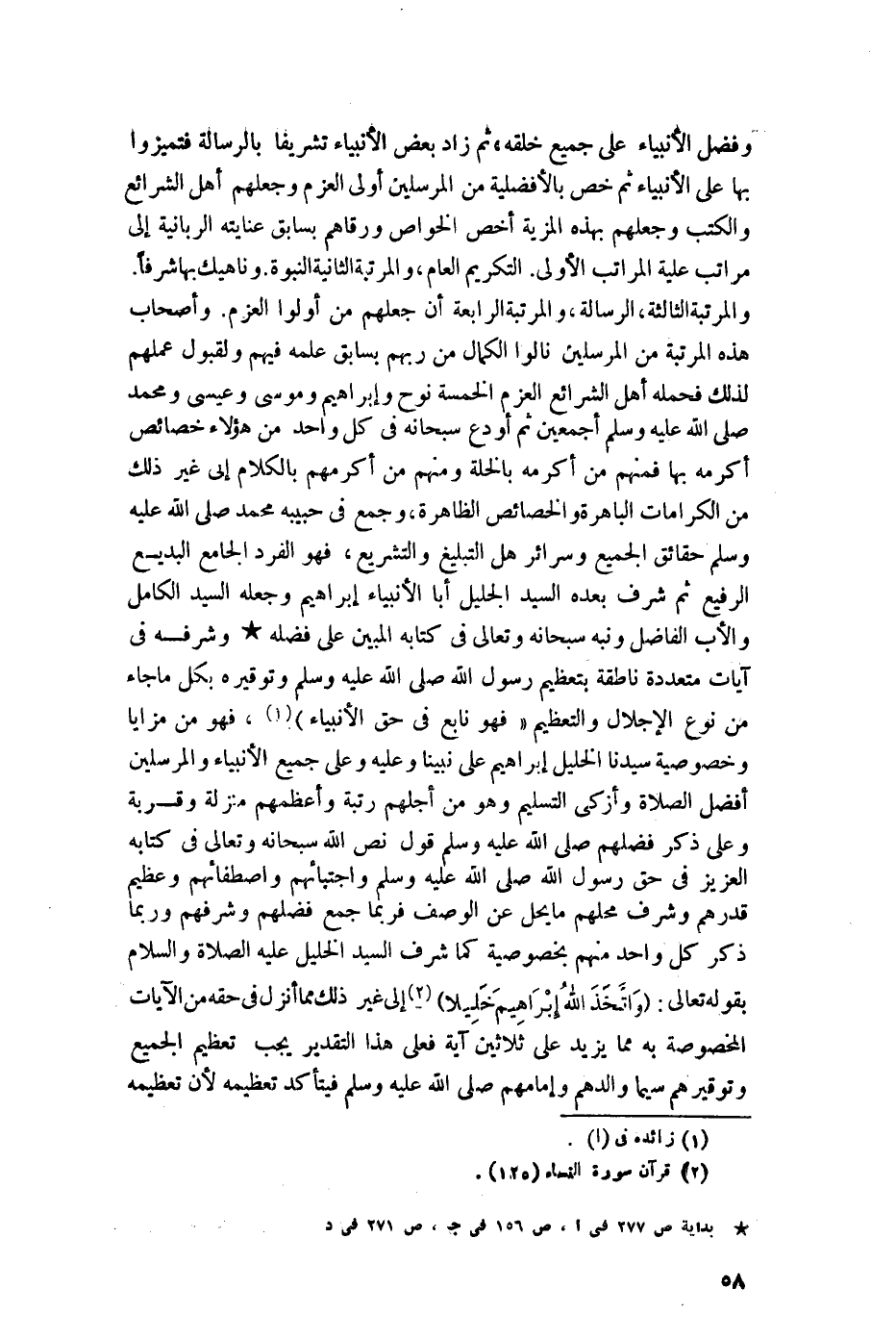 وفضل الأنبياء على جميع خلقه، ثم زاد بعض الأنبياء تشريفًا بالرسالة فتميزوا بها على الأنبياء ثم خص بالأفضلية من المرسلين أولي العزم وجعلهم أهل الشرائع والكتب وجعلهم بهذه المزية أخص الخواص ورقاهم بسابق عنايته الربانية إلى مراتب عليت المراتب الأولى، التكريم العام، والمرتبة الثانية النبوة، وناهيك بها شرفًا، والمرتبة الثالثة، الرسالة: والمرتبة الرابعة أن جعلهم من أولى العزم وأصحاب هذه المرتبة من المرسلين نالوا الكمال من ربهم بسابق علمه فيهم ولقبول عملهم لذلك فحمله أهل الشرائع أولو العزم الخمسة نوح وإبراهيم وموسى وعيسى ومحمد صلى للَّه عليهم أجمعين ثم أودع سبحانه في كل واحد من هؤلاء خصائص أكرمه بها فمنهم من أكرمه بالخلة ومنهم من أكرمه بالكلام إلى غير ذلك من الكرامات الباهرة والخصائص الظاهرة، وجمع في حبيبه محمد -صلى اللَّه عليه وسلم- حقائق الجميع وسرائر أهل التبليغ والتشريع، فهو الفرد الجامع البديع الرفيع ثم شرف بعده السيد الجليل أبا الأنبياء إبراهيم وجعله السيد الكامل والأب الفاضل ونبه سبحانه وتعالى في كتابه المبين على فضله وشرفه في آيات متعددة ناطقة بتعطم رسول اللَّه -صلى اللَّه عليه وسلم- وتوقيره بكل ما جاء به من