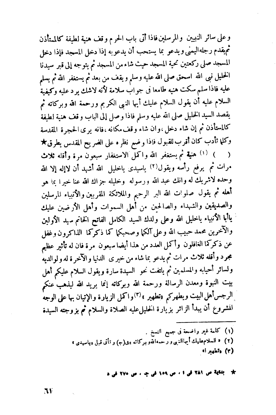 وكيفية السلام عليه أن يقول: السلام عليك أيها النبي الكريم ورحمة اللَّه وبركاته ثم يقصد السيد الخليل -صلى اللَّه عليه وسلم- فإذا وصل إلى الباب وقف هنية لطيفة كالمستأذن ثم إن شاء دخل، وإن شاء وقف مكانه، فإنه يرى الحجرة المقدسة وكلما تأدب كان أقرب للقبول، فإذا وضع نظره على الضريح المقدس يطرق (بروحه) هنية، ثم يستغفر اللَّه وأكمل الاستغفار سبعون مرة وأقله ثلاث مرات ثم يرفع رأسه ويقول: يا سيدي يا خليل اللَّه أشهد أن لا إله إلا اللَّه وحده لا شريك له وأنك عبد اللَّه ورسوله وخليله جزاك اللَّه عنا خيرًا بما هو أهله ثم يقول: صلوات اللَّه البر الرحيم والملائكة المقربين والأنبياء المرسلين والصديقين والشهداء والصالحين من أهل السموات وأهل الأرضين عليك يا أبا الأنبياء يا خليل اللَّه وعلى ولدك السيد الكامل الفاتح الخاتم سيد الأولين والآخرين محمد حبيب اللَّه وعلى آلكما وصحبكما كلما ذكركما الذاكرون وغفل عن ذكركما الغافلون، وأكمل العدد من هذا أيضًا سبعون مرة فإن له تأثيرًا عظيمًا مجردًا وأقله ثلاث مرات ثم يدعو بما شاء من خيري الدنيا والآخرة له ولوالديه ولسائر أحبابه والمسلمين ثم يلتفت نحو السيدة سارة ويقول: السلام عليكم أهل بيت النبوة ومعدن الرسالة ورحمة اللَّه وبركاته إنما يريد اللَّه ليذهب عنكم الرجس أهل البيت ويطهركم "تطهيرًا" وأكمل الزيارة والإتيان بها على الوجه المشروع أن يبدأ الزائر