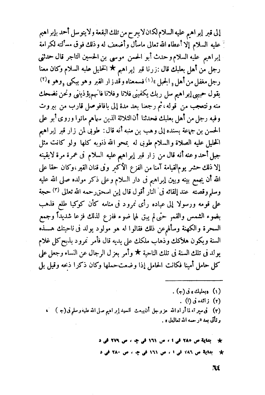 إلى قبر إبراهيم -عليه السلام- لكان لا يبرح من تلك البقعة، ولا يتوسل أحد بإبراهيم -عليه السلام-، إلا أعطاه اللَّه تعالى ما سأل وأضعف له وذلك فوق مسألته لكرامة إبراهيم -عليه السلام- وحدث أبو الحسن موسى بن الحسين التاجر قال: حدثني رجل من أهل بعلبك قال: زرنا قبر إبراهيم الخليل -عليه السلام- وكان معنا رجل مغفل من أهل الجبل فسمعنا وقد زار القبر وهو يبكي وهو يقول: حبيبي إبراهيم سل ربك يكفيني فلانًا وفلانًا فإنهم يؤذياني ونحن نضحك منه ونتعجب من قوله، ثم رجعنا بعد مدة إلى يافا فوصل قارب من بيروت وفيه رجل من أهل بعلبك فحدثنا أن الثلاثة الذين سماهم ماتوا.